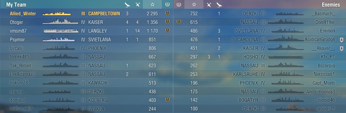 War aber auch bis auf dem Träger ein enttäuschendes Team. Lemmingtrain nach A nur ein paar sind Richtung D gefahren. Ploppen die Zerstörer auf, wird man komplett allein gelassen. Hätte auch anders Enden können. Hätte ich D nicht gehalten wäre das Match wohl verloren gegangen, da das Team bei A wieder nicht Vorstoßen kann. Es ist immer das gleiche. Da fährt eine Flotte komplett zu einem Cap und dann wird da nur halbherzig defensiv gespielt. In der Regel verliert man dann.