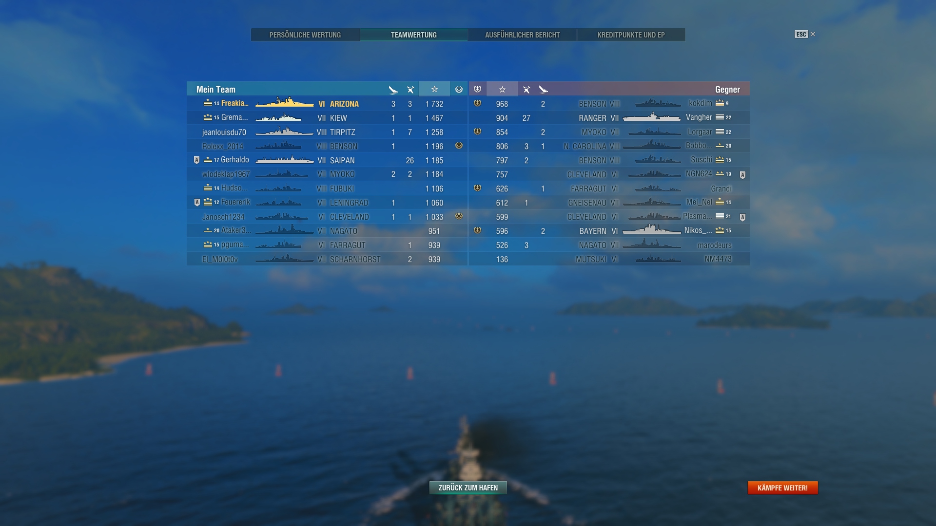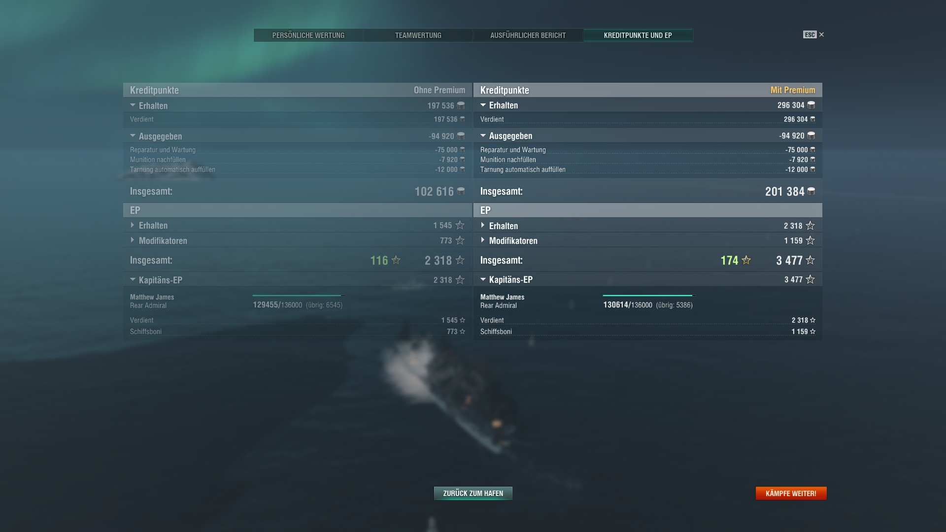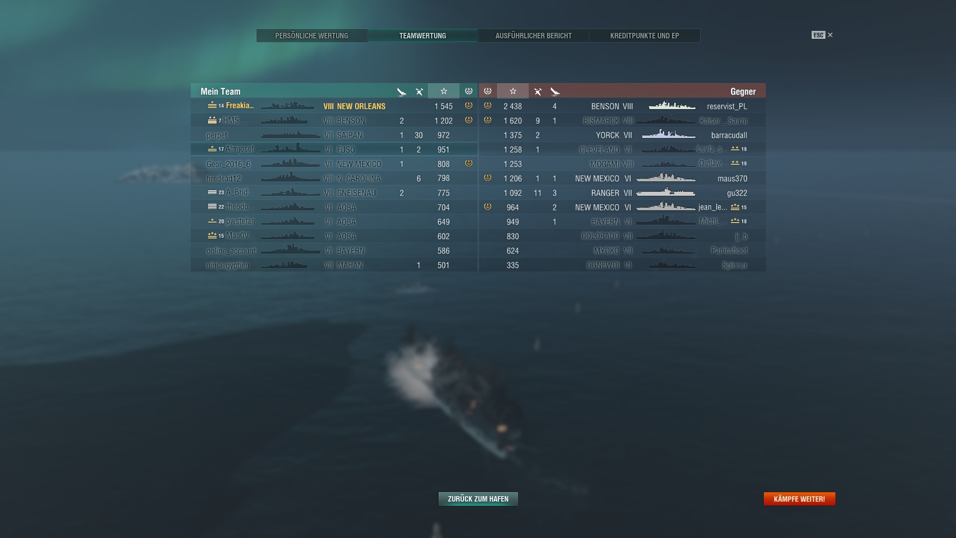 Er stand am Ende auf Platz 1 in der Teamliste(logisch, denn Hightier(ich in Colo) und ne Menge sinnloser Damage gemacht, während er die ganze Zeit der Gegnerischen Iowa hinterherhechelt, wie ner Möhre, während wir ein cap nach dem anderen verlieren.