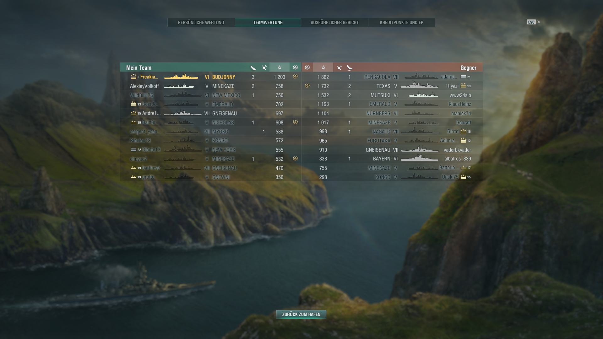 Fahre jetzt mal wieder öfters die Kutuzov und man ist die stark. Hohe Schußfolge, sehr gute Reichweite und BB's brennen wie Weihnachtsbäume. Habe heute einem Russen Kreuzer mit AP 6 Zitadellen mit einer Salve gemacht. Wenn es in der Kutuzov brenzlig wird, dann Rauch zünden und fröhlich weiter schießen. Da stand plötzlich eine Iowa neben mir im Rauch und habe ich mich vielleicht erschreckt.