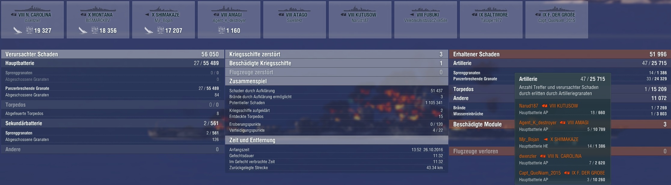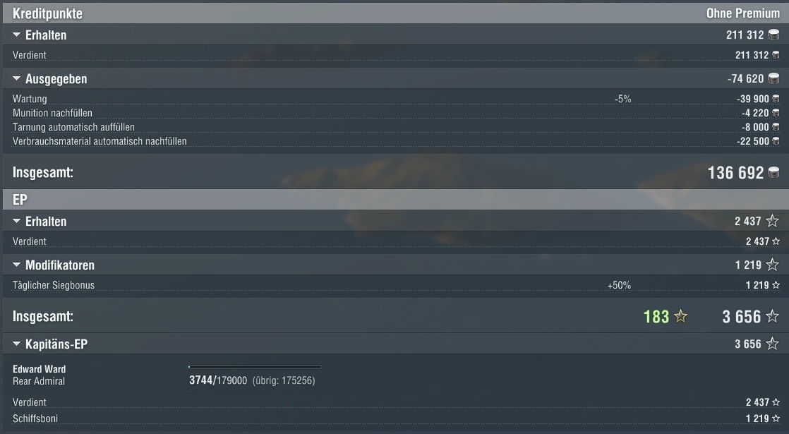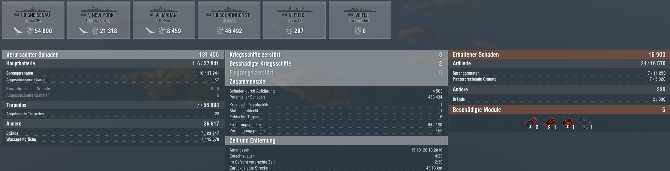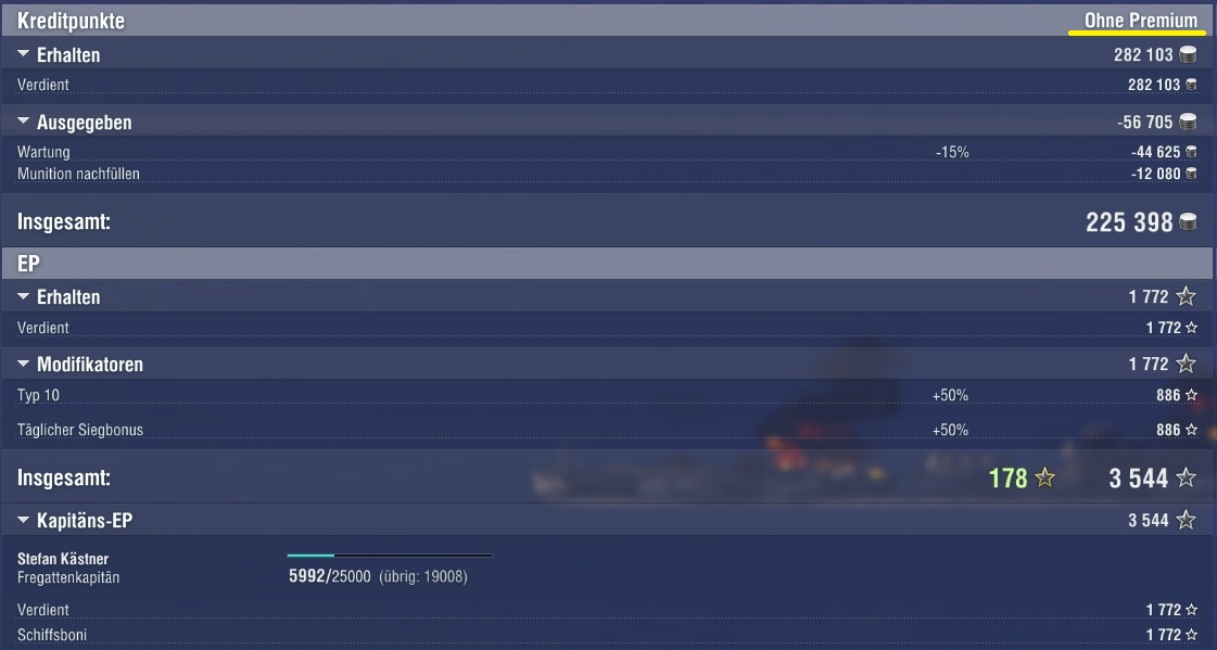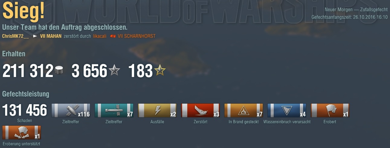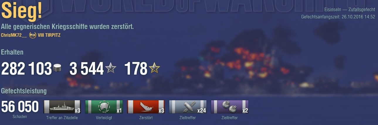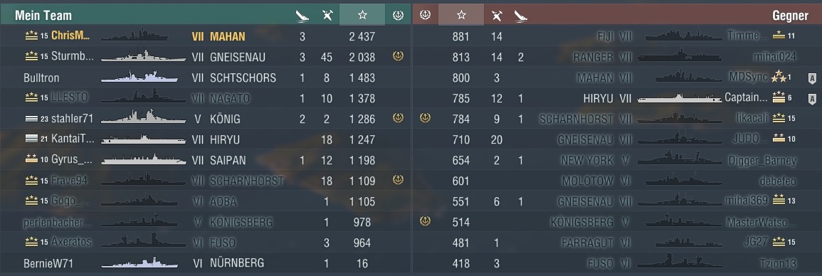 Das hätte sogar noch weitaus mehr sein können. Leider war die Runde nur schon vorbei. Glück für den Gegner, hehe. Die Königsberg war schon fast down, die Cleveland auch. Und die Scharnhorst hätte auch ein, zwei Feuerchen gekriegt. Waren alle auch nicht weit weg.