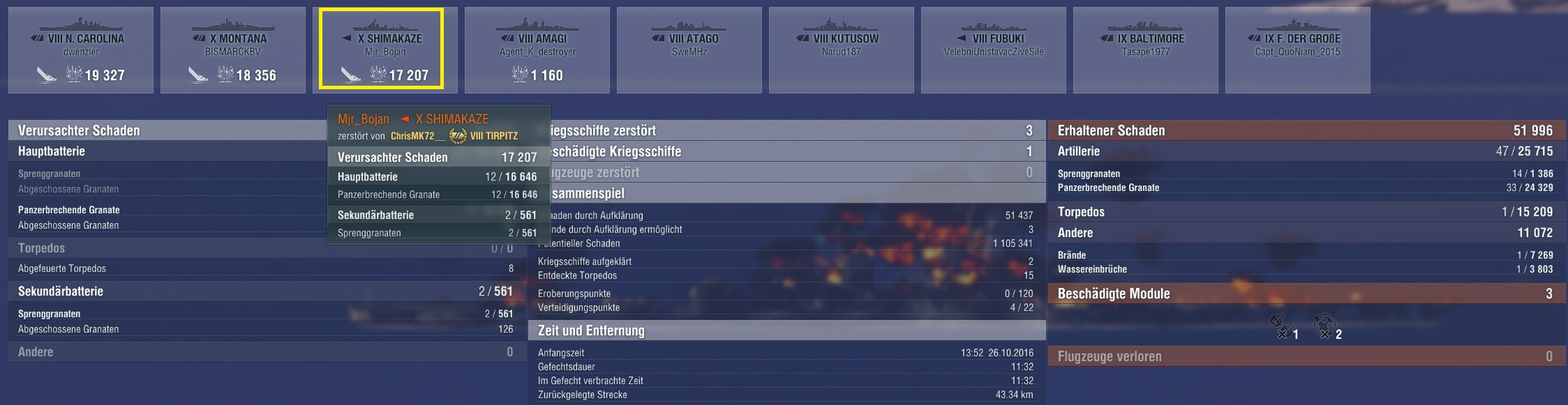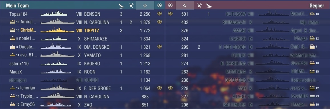 Hatte keinen besonders hohen Damage aber sehr Teamdienlich gespielt und wir hatten glaub ich nur die Fubuki als Verlust und beide Caps gehalten.