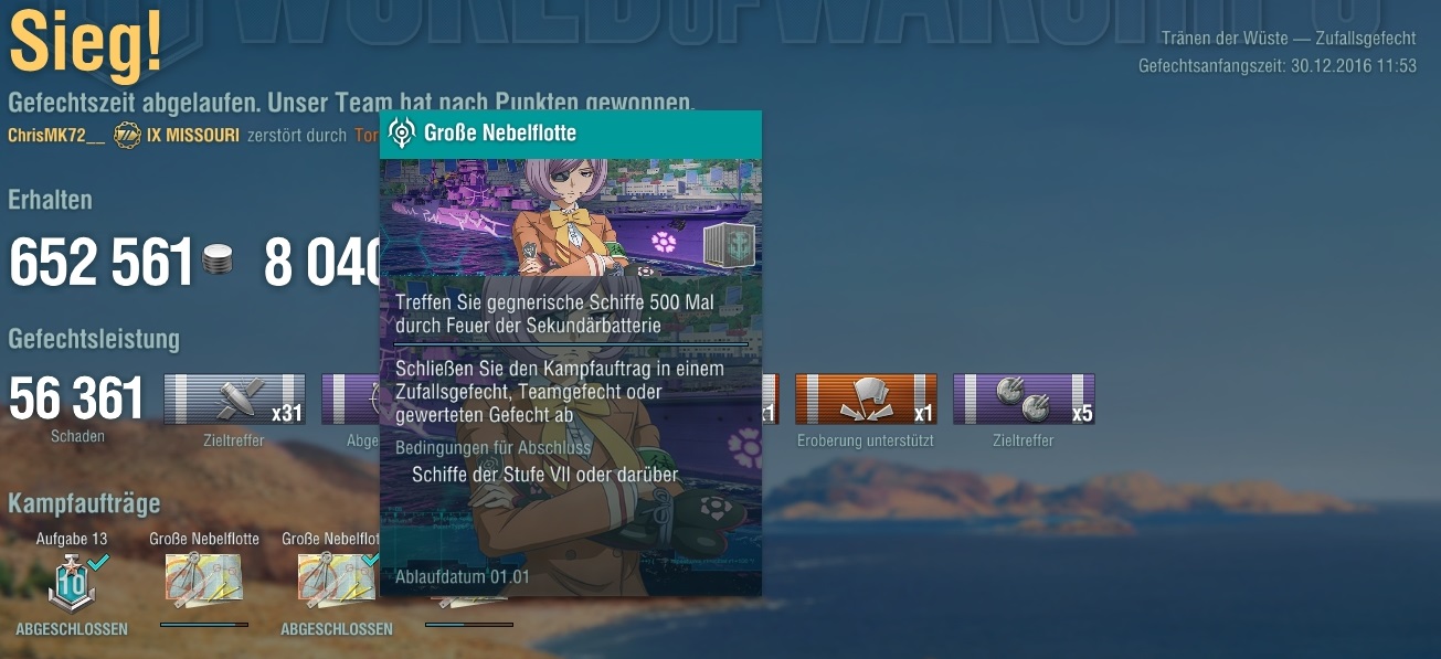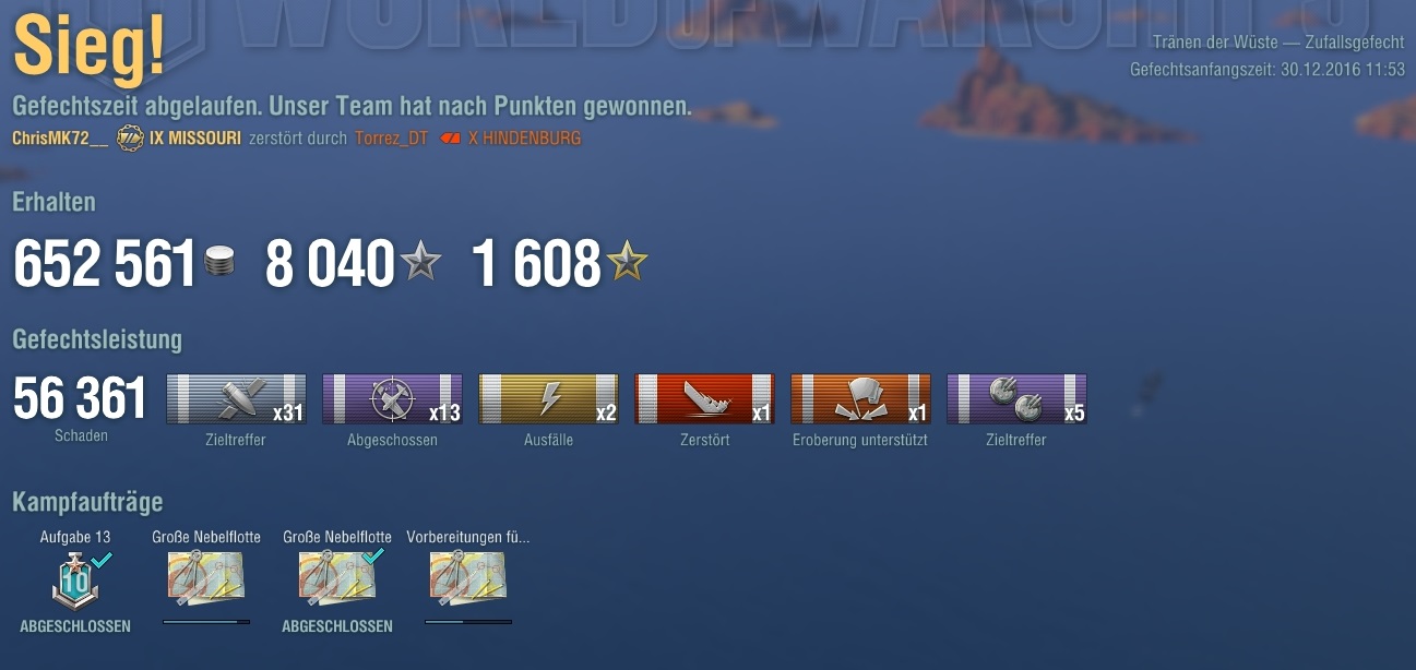 Evtl. hat die ein, oder andere Aktion geholfen, wo ich mit meiner Tirpitz hinter ne NC her war, um die zu Torpen, die aber vor mir weggefahren ist.