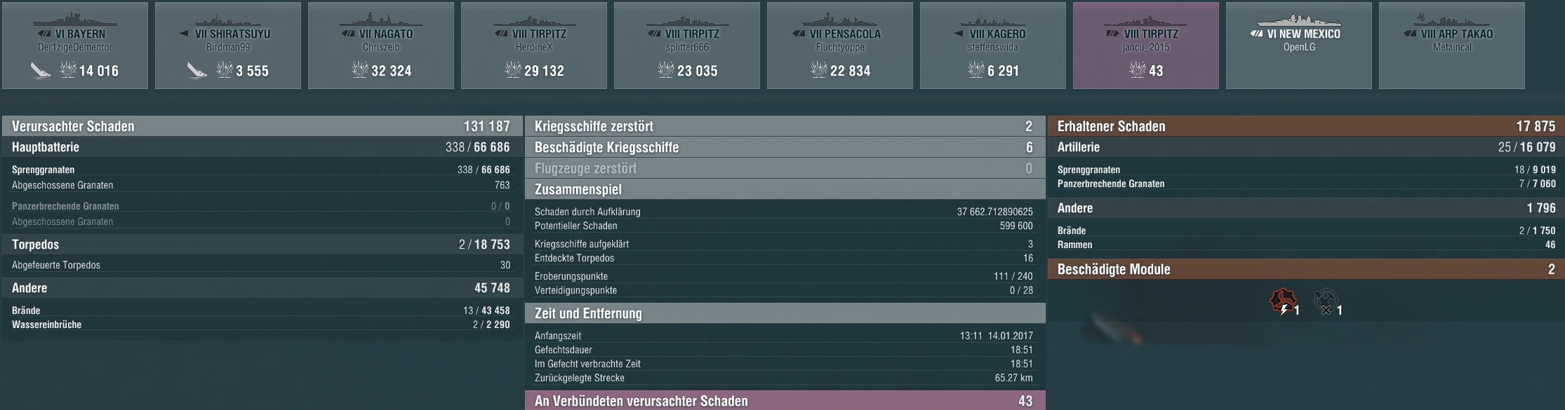 Bin nicht nur weiter scouten gegangen, sondern nach vorn, erst die Pensa mit Torps bearbeitet, die mittlerweile auf 7 Km ran war und dann offen rumgefahren auf Pensa und 2 Tirpitze(in 10 und 12 KM Entfernung) geschossen.