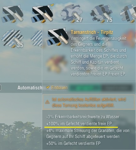Wenn ich das richtig mitbekommen habe, sieht nur die Tirpitz-Tarnung anders aus. Der Rest (Spee eingeschlossen) ist optisch einfach eine permanente Variante der Neujahrs-Event-Tarnung.