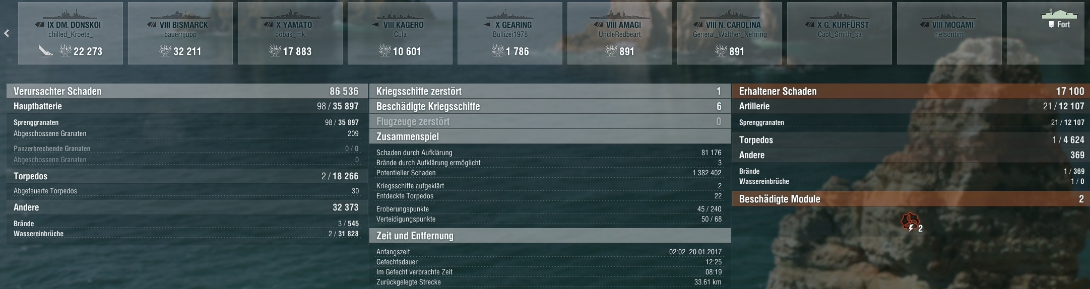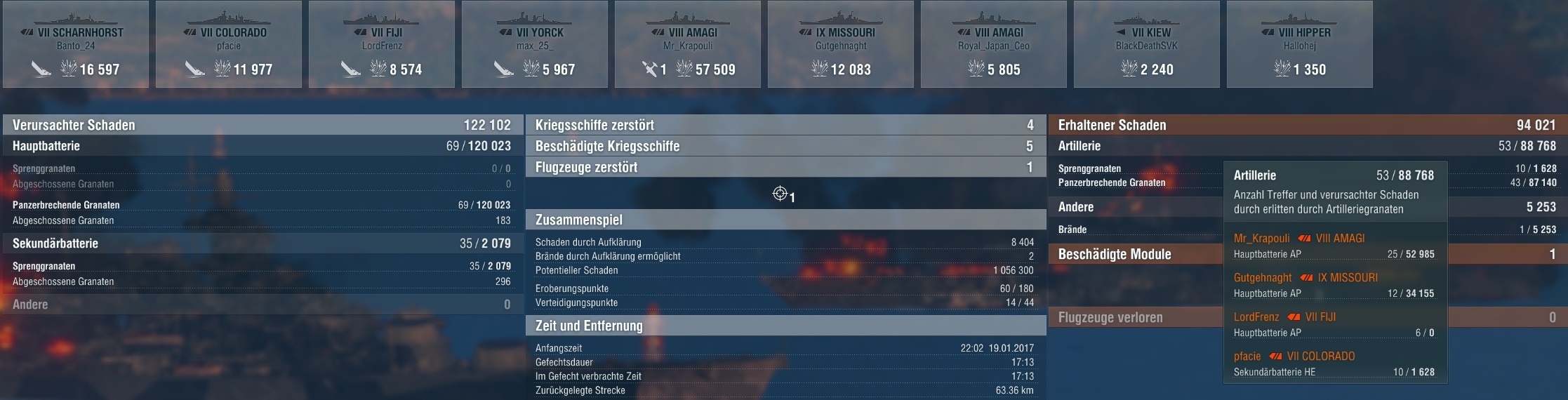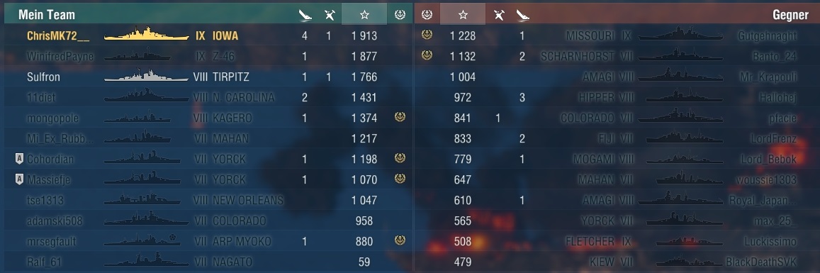 Die Missouri war hinter mir her, zu weit in Front von seinem team und wurde im Fokusfeuer zerlegt. Hab die immer schlecht erwischt und mit 14 Treffern unter 12k Damage gemacht an der. Vom gegner gab's immer harte Treffer auf mich im Gegenzug.