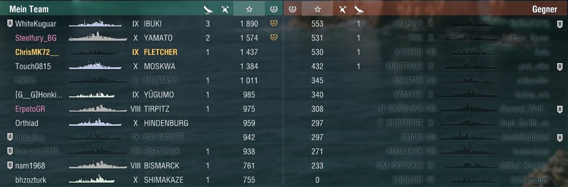 Wieder weiter Richtung Funkortung und nächstem Gegner. Diesmal ne Amagi, die aber ne Fiji mit dabei hatte: Ich ballerte so schnell es ging auf die Amagi und dann noch auf die Fiji. 6 Murmeln versenkten die Fiji, die für mich besser als Ziel fuhr, denn breitseite und dann noch etwas Schaden an Amagi gemacht. Die Tirpitz hat ihr den Rest gegeben.