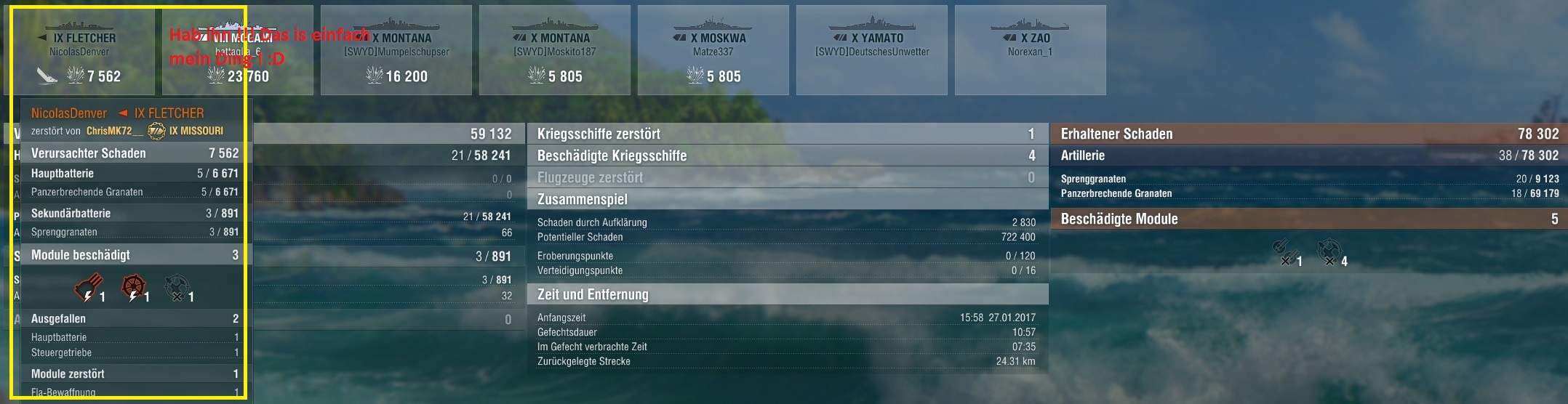 Und alle seine Torps gingen vorbei. Der hat bestimmt doof geguckt, dass ich nicht von seinem Nebel weg bin, sondern straight drauf zu, als irrer DD Jäger !![]()