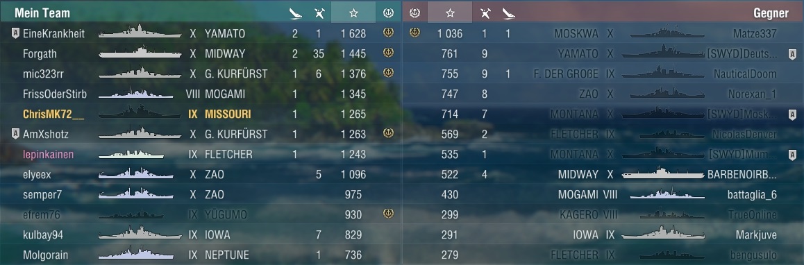 Da ich schon raus war, konnte ich der Yamato die ich vorher eingenebelt habe zusehen... rote Kagero und Benson werfen der Frontal auf sie zufahrenden Yamato alle Torps entgegen und RNG schlug im Vierer-Pack zu... alle 4 Werfer bildeten genau für die Yamato eine Lücke, der brauchte nicht mal den Kurs zu ändern...