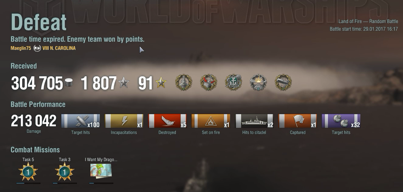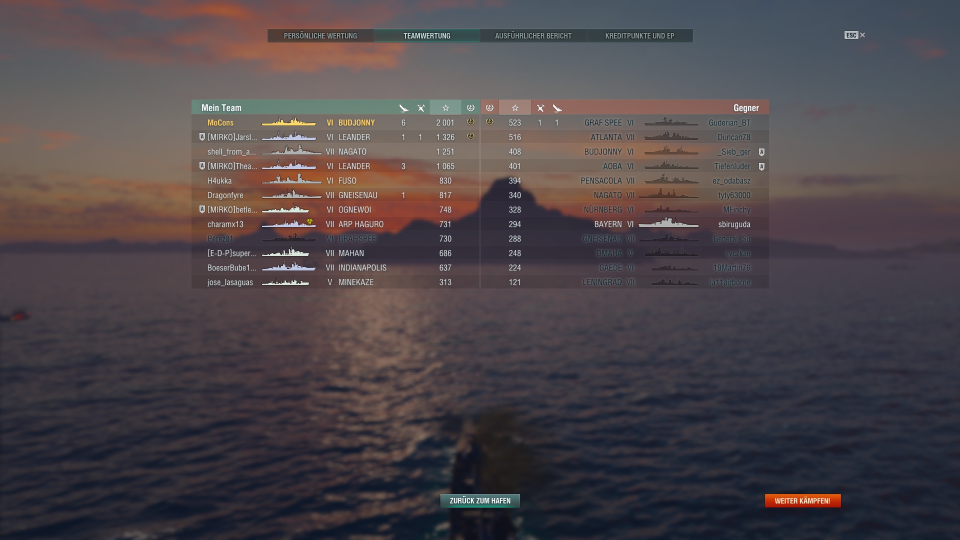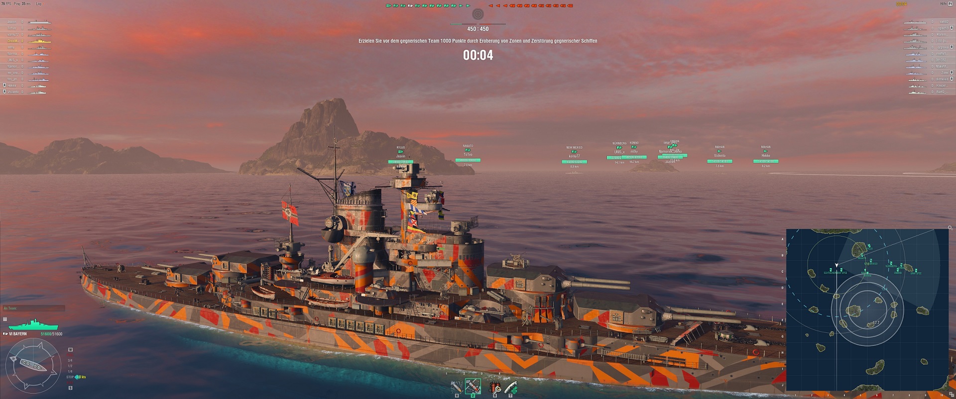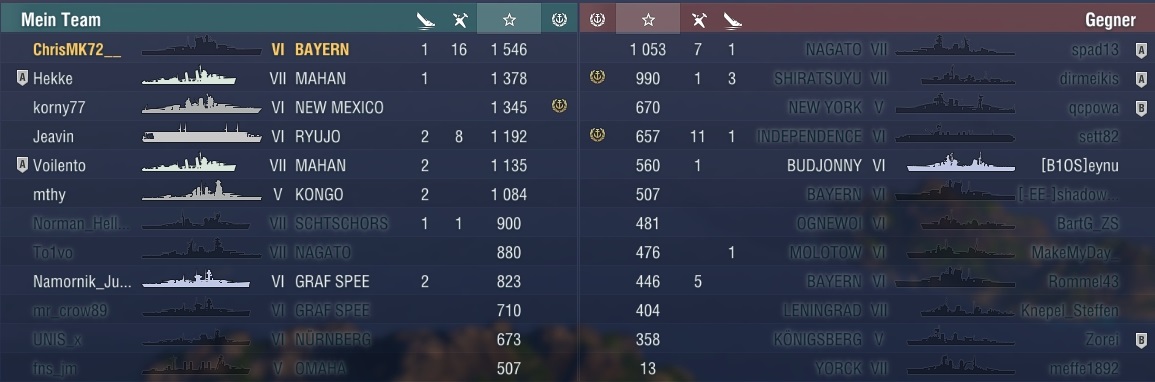 Bei dem Match war das Ende sehr witzig. Die New Mexico war als einziges noch übrig und leider keiner weiter weit und breit in der Nähe. Da die NO einen recht guten Wendekreis und Ruderstellzeit hat + passabel drehende Türme -> ran an die New Mexico, die zu dem Zeitpunkt noch fast volle HP hatte, ich aber leider nur noch ~30%. Konnte mit der AP ihr gut etwas verpassen und sie schön nahe umrunden, leider holten die Türme der New Mexico dann doch auf und ich dachte mir: ach, Rammgeschwindigkeit und fertig. Angestupst die New Mexico also und bin drauf gegangen, aber eine Flutung verursacht, die die New Mexico mitgenommen hat.