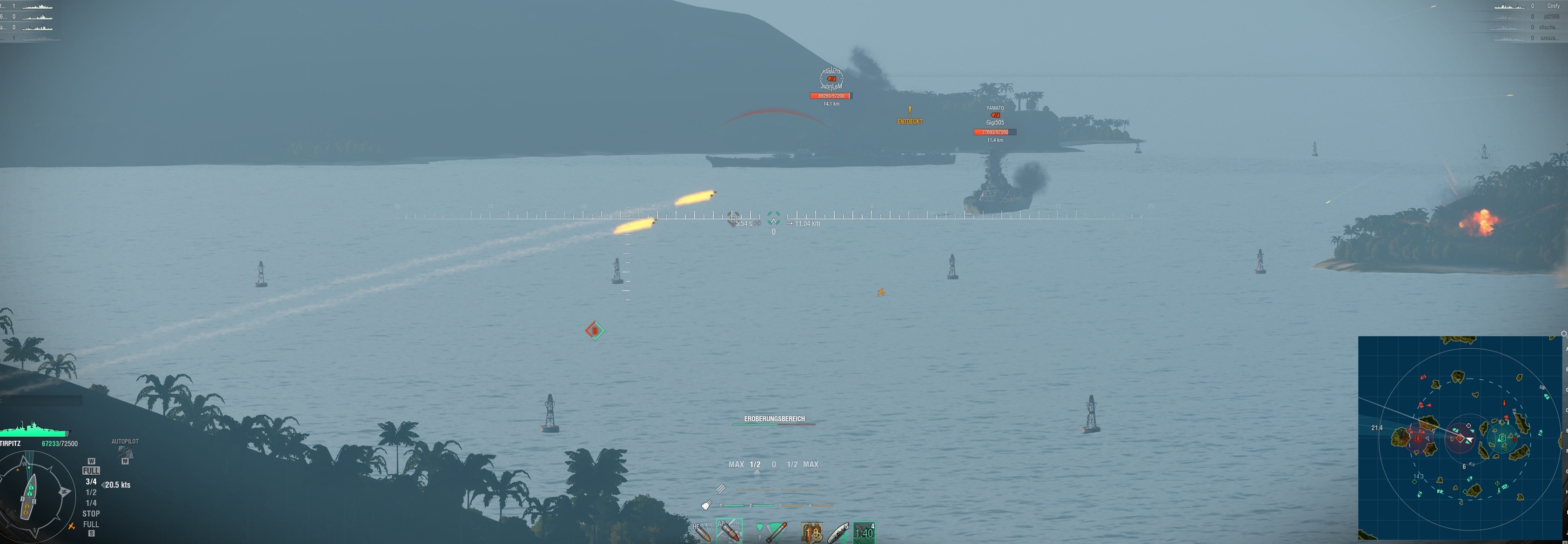 Normal hätt ich natürlich eher wie unsere Bismarck spielen sollen und mich dezent zurückhalten, um dann die Yamatos zu flanken, aber ich konnte es für den Test natürlich nicht lassen, direkt vorzupreschen, Vollgas zu geben und beim Cap zurückerobern zu helfen.
