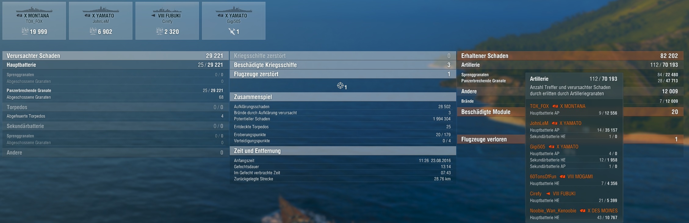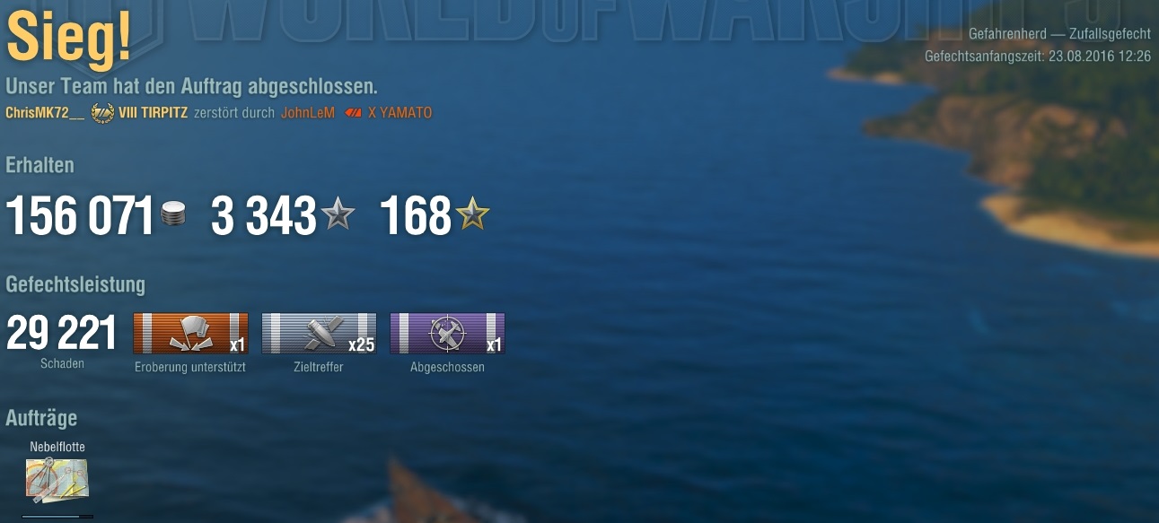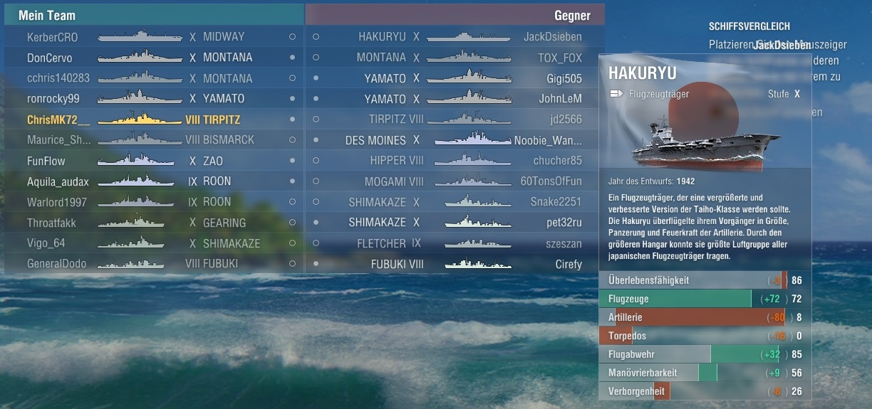 Eigentlich hätt ich so nicht gespielt und ich hab mich eher gewundert, warum ich noch so lange überlebt hab, dass ich tatsächlich noch mit gecappt hab, da man sich ja nicht alltäglich mit 2 Shimas und ner Fubuki um ein cap kloppt, während noch 2 Yamatos, ne Montana und auch noch Schiffe wie Des Moines und Mogami auf einen ballern, während die T10 Flieger über einen kreisen.