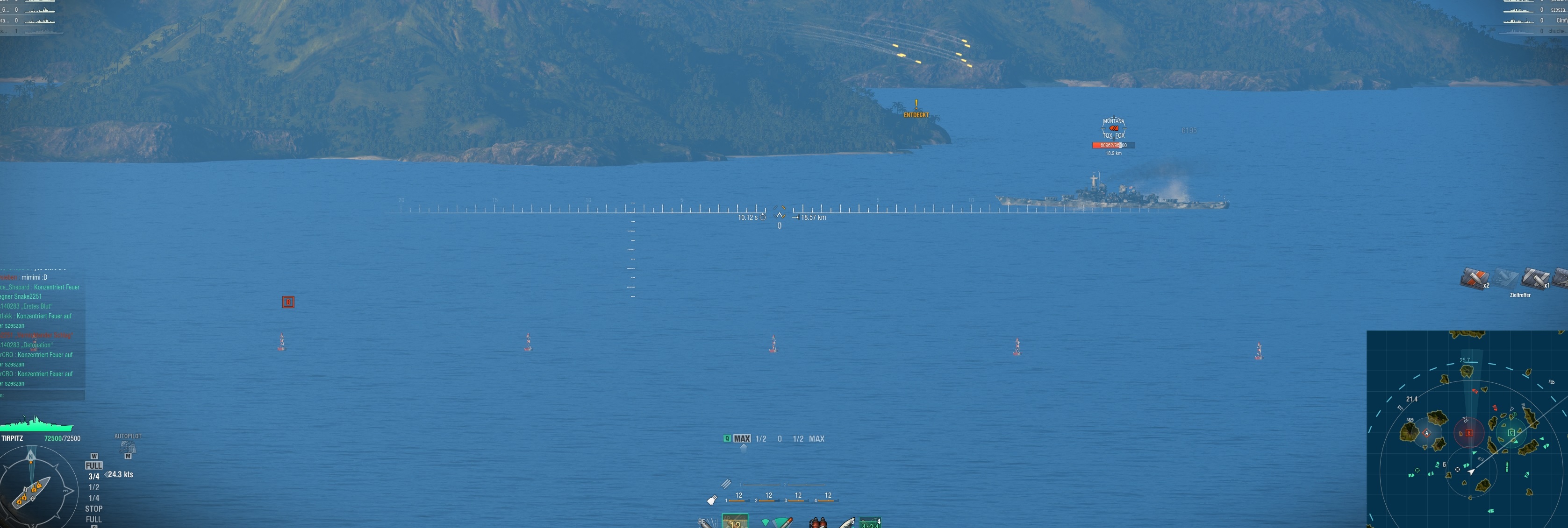 Ich konnte gar nicht allem immer ausweichen, denn irgendwo musste ich auch mal breitseite zeigen, beim ausweichen, wobei ich mir aussuchen konnte, nehm ich diese Yamato, diese, oder doch lieber die Montana, oder den Torpedoteppich, oder den ? Also gut für den Test.