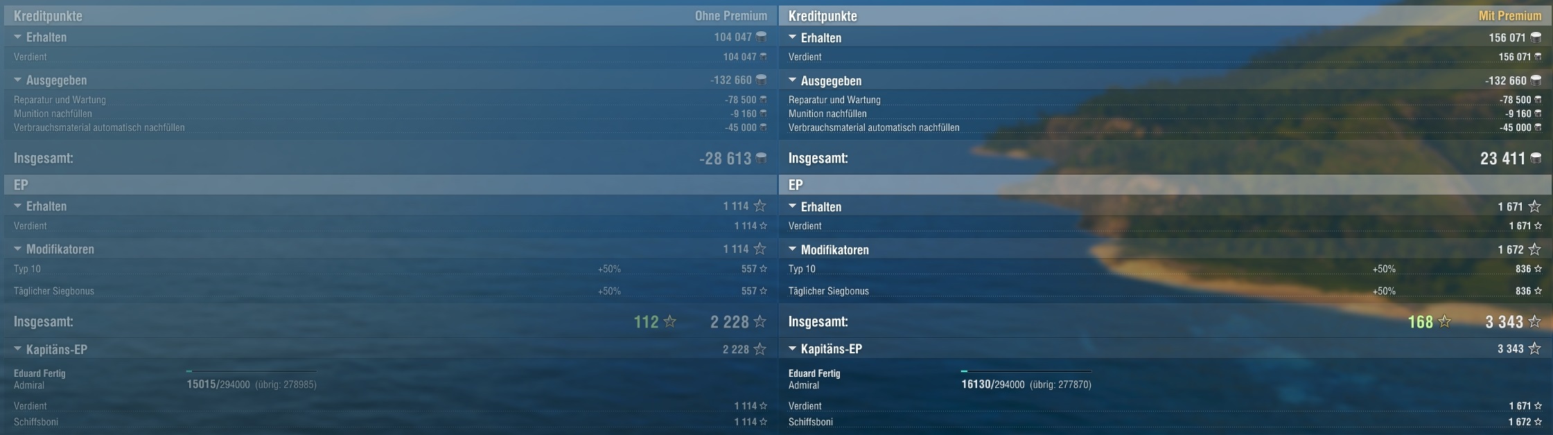 Extra ohne Bonusfahnen, aber mit 2 Premium Consumables ! Guckt mal auf die nicht Premiumaccount-Seite ! Knappe 30k Minus ! Ohne Extra-Boni und nicht gut spielend, also durchaus machbar auch mit der Tirpitz Minus zu machen.