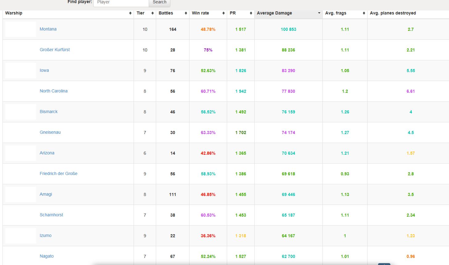 Die Kongo noch super gut - 65% Win, WTR 2.155 und 62k Damage, bei 1,56 Kills, liegt genau hinter Nagato - schon recht gut für ein T5 mit 8 Guns.