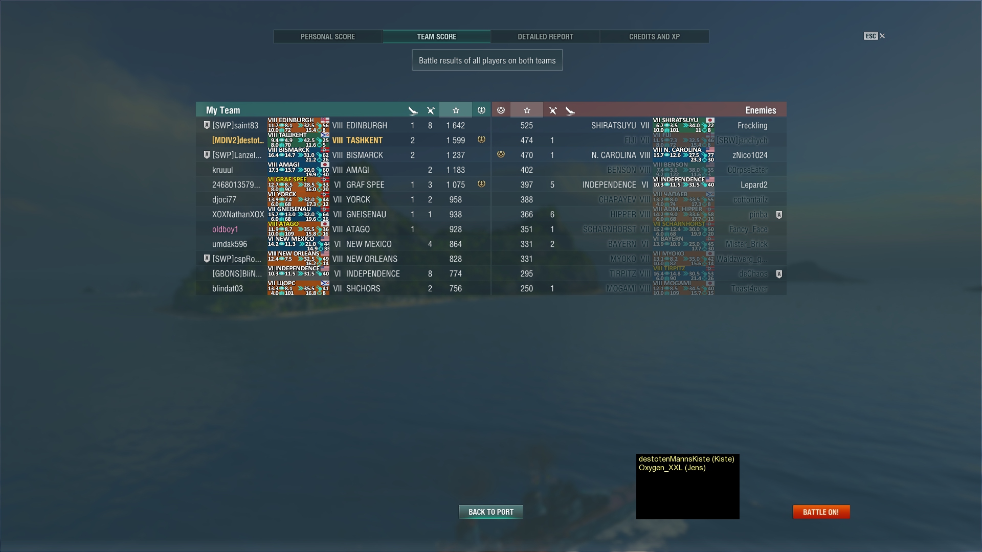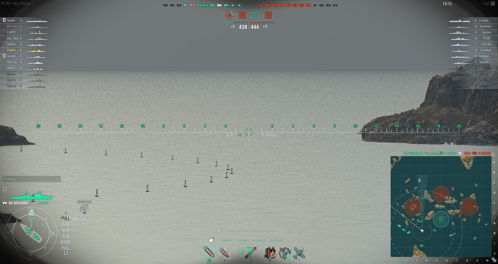 Übrigens hatte ich heute einen Bug oder der Gegner war ein Cheater. Schaut mal. Das andere Schiff ist schon von einem Mitspieler aufgedeckt worden, das Schiff ist sogar schon in meiner Schussreichweite, kein Nebel etc. und trotzdem kann ich das Schiff nicht sehen. Vielleicht war es auch der Client, der ist vorher erst abgestürzt, sodass ich das Spiel neu starten musste. (deshalb auch nach 6 min noch keinen Schaden verteilt)