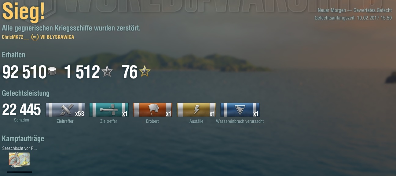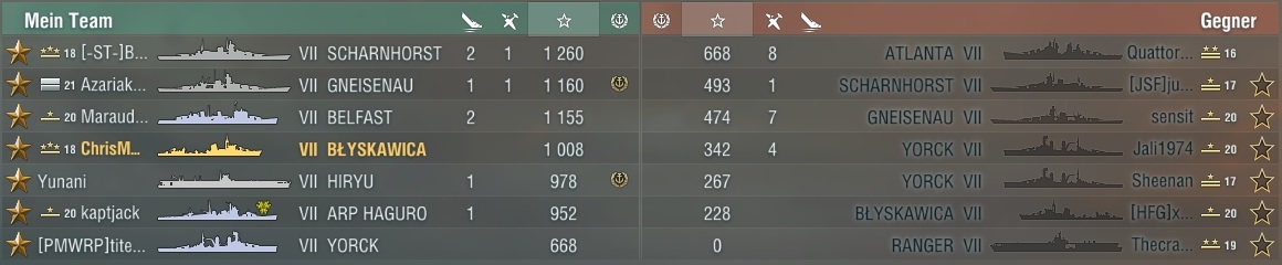 So könnte ein erstes Ranked Spiel mit ihr aussehen, ohne Premium, wenn man vorsichtig fährt(da auch Belfast, Dragon, Scharn und Gneise in der Nähe waren + 2 DDs).