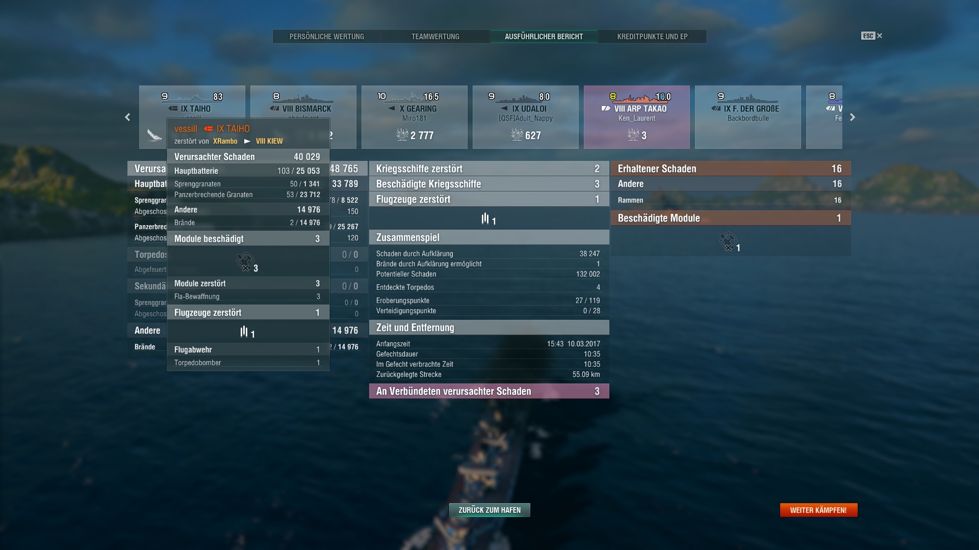 Gestern mal in der Hindenburg ne Moskwa top erwischt, die war im Fight mit unserer Tirpitz und ich kam hinter der Insel vor - 8km perfekte Winkel - 1. Salve 5x Cita und 32k Damage, 2. Salve Moskwa wech - hab ich nicht sofwas, aber da freu ich mich dann schon wie ein Schneekönig - 32k Hit mit nem CA