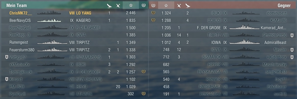 Man kann Nahkämpfe mit der Scharnhorst natürlich trotzdem gewinnen, wenn die Gegner sich etwas blöd anstellen. Das dürfte auch oft klappen, weil viele BB-Spieler halt lieber aus der Distanz snipern und Nahkämpfe nicht gewohnt sind. Aber es bleibt halt meiner Meinung nach keine besondere Stärke der Scharnhorst.