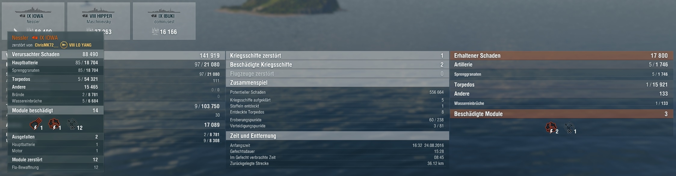 Da fährt er über 5 Minuten lang, ganz für sich allein, fast am Kartenrand entlang parallel zur halben feindlichen Flotte, in praktisch perfekter Entfernung und seine Breitseite präsentierend... und fast keiner macht sich die Mühe auf ihn zu feuern! Er kann sich fast ungestört austoben, abgesehen von der einen York, die selbstmörderisch allein auf ein BB losgeht.