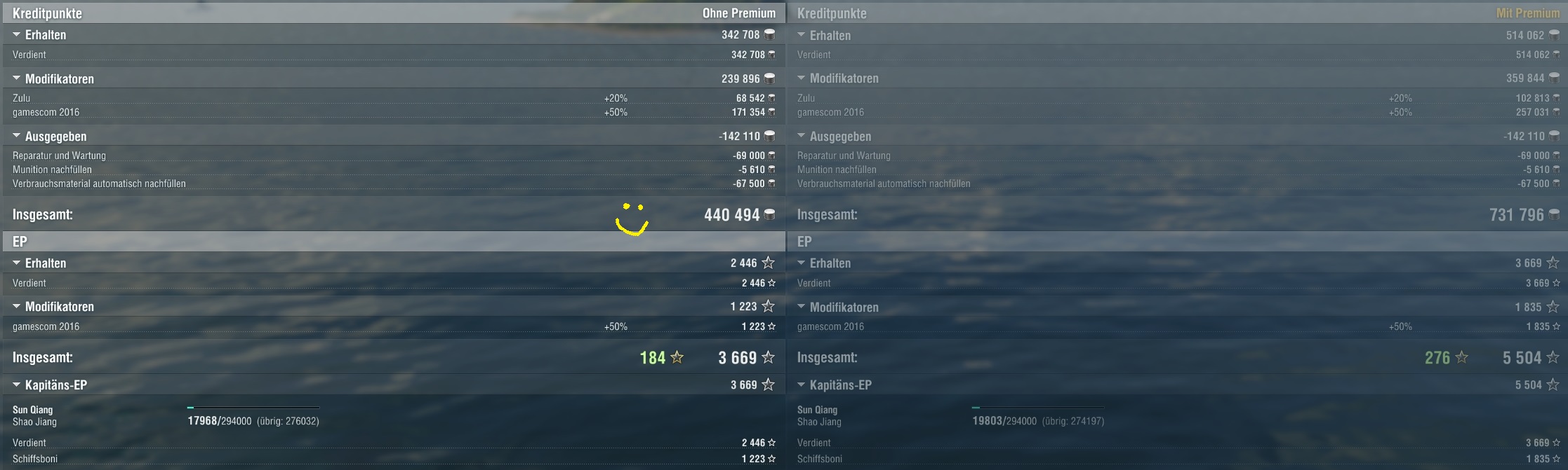 Habe in der Scharnhorst jetzt 10 Gefechte gemacht, 5 Davon gewonnen und eine Durchschnitt XP von 1,776 bei 68K Schaden. Das muß auch noch besser werden.