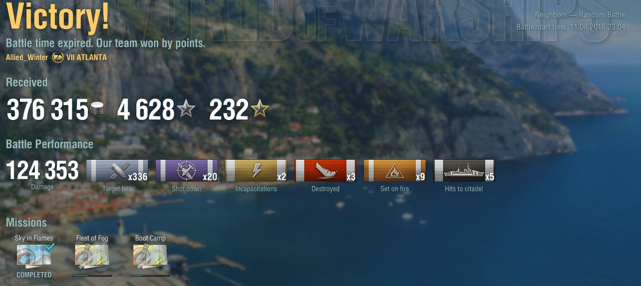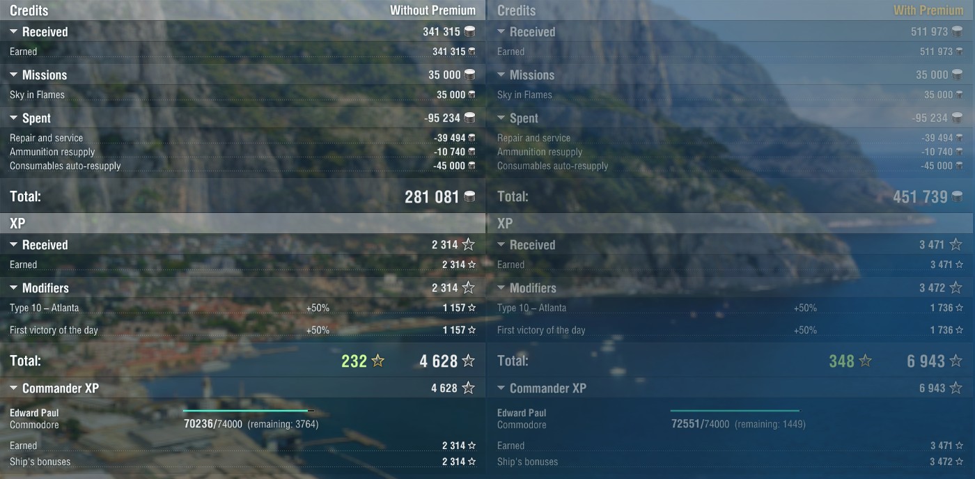 Zusätzlich kann man sich noch eine dekorative Fahne erspielen, wenn man mit jedem Schiffstyp einmal die meiste XP in einem Gefecht schafft. Ich beiß mir beim BB die Zähne aus, bin einfach kein BB-Fahrer