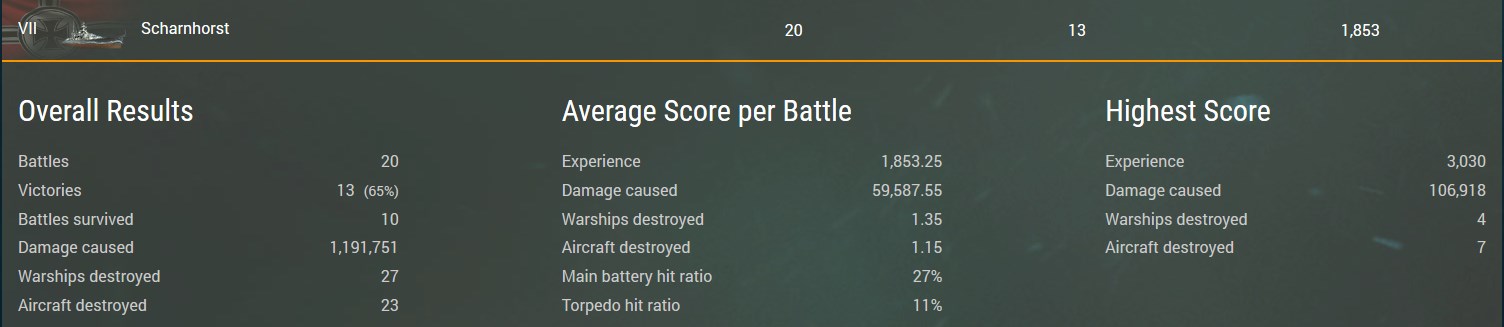 Ich habe nach 37 Runden etwas über 70K Durchschnitts-Schaden mit dem Horst, womit ich sogar etwas über der Tirpitz liege und direkt unter Izumo und Iowa. Da kann ich mich bisher also nicht beschweren. Auch die Win-Rate passt mit fast 60%.