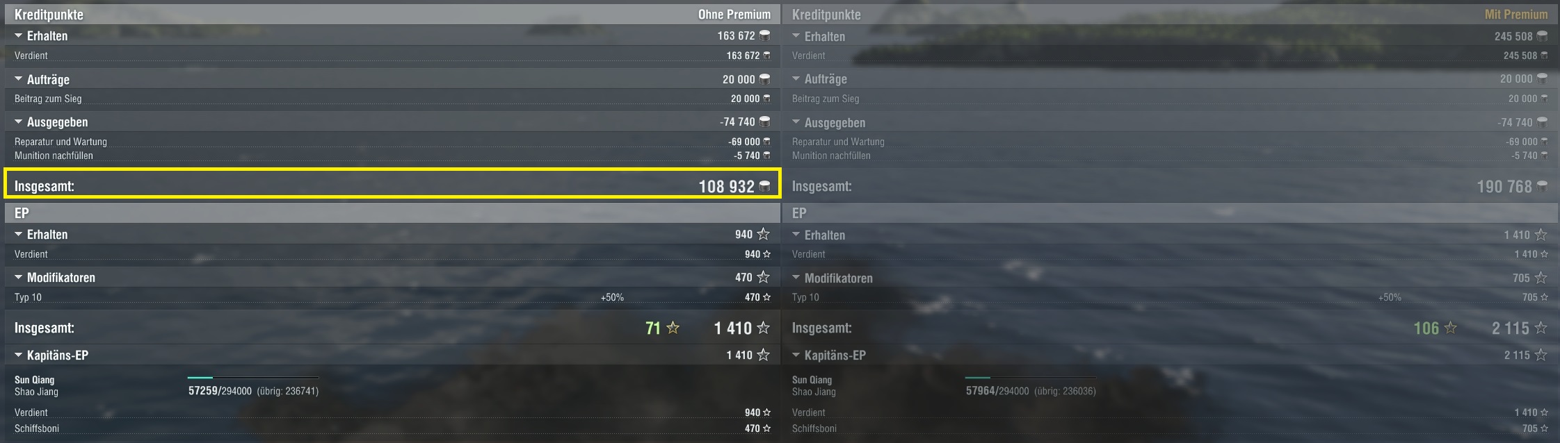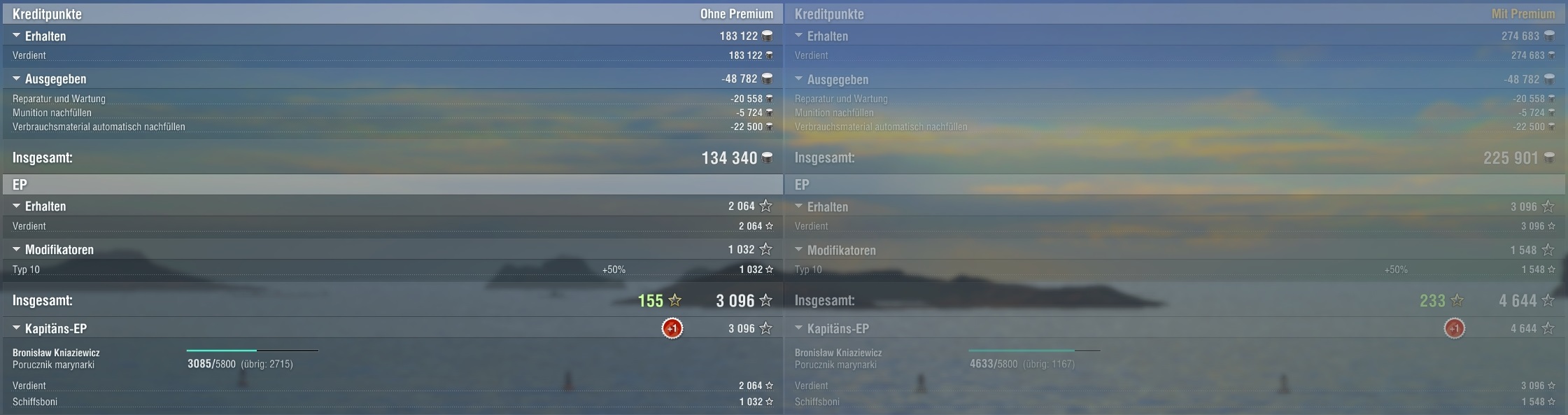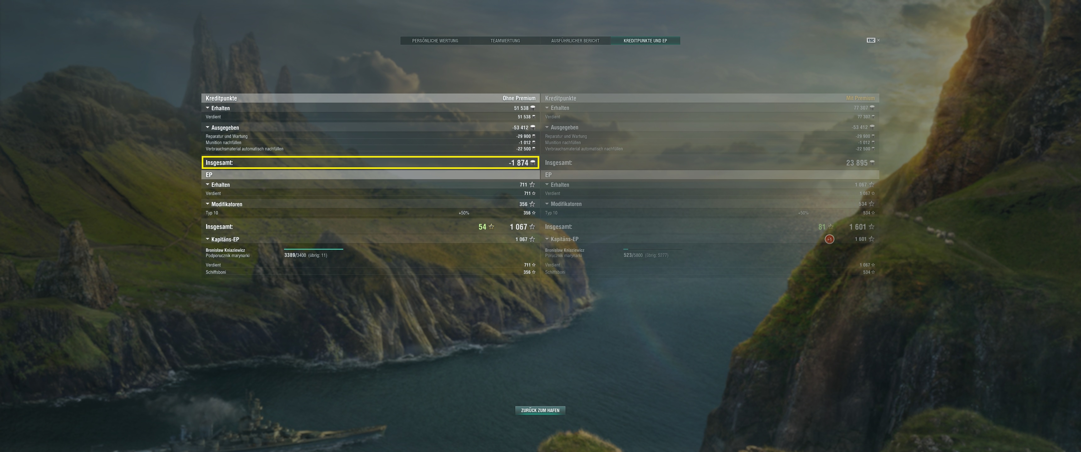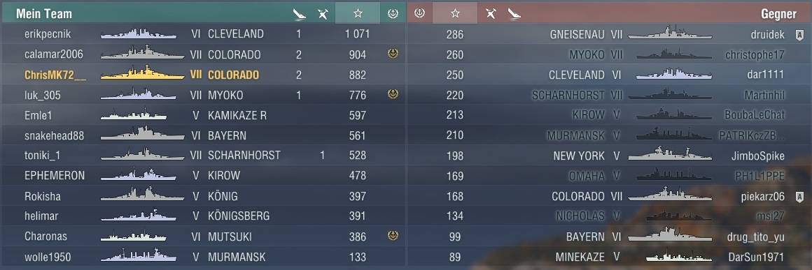 Manchmal läuft es halt bescheiden ... . Gneisenau geht bis jetzt. Ist nicht aussagekräftig, aber ich habe von 3 Spielen 2 gewonnen bisher mit ihr und das mit im Durchschnitt 77k Schaden. Naja, das ist okay wenn es denn so bleiben würde ... . Die Gneisenau ist allerdings noch sogut wie stock.