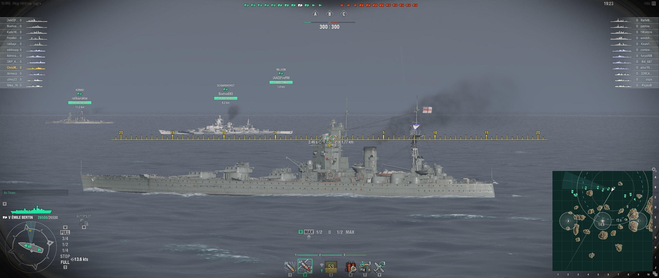 Dann smoke, cap von Gegner DDs freigehalten und die gegnerische Bismarck war in der zeit direkt hinter der insel, da unser Team es sich anders überlegt hat und dann doch kommplett zu A ist.