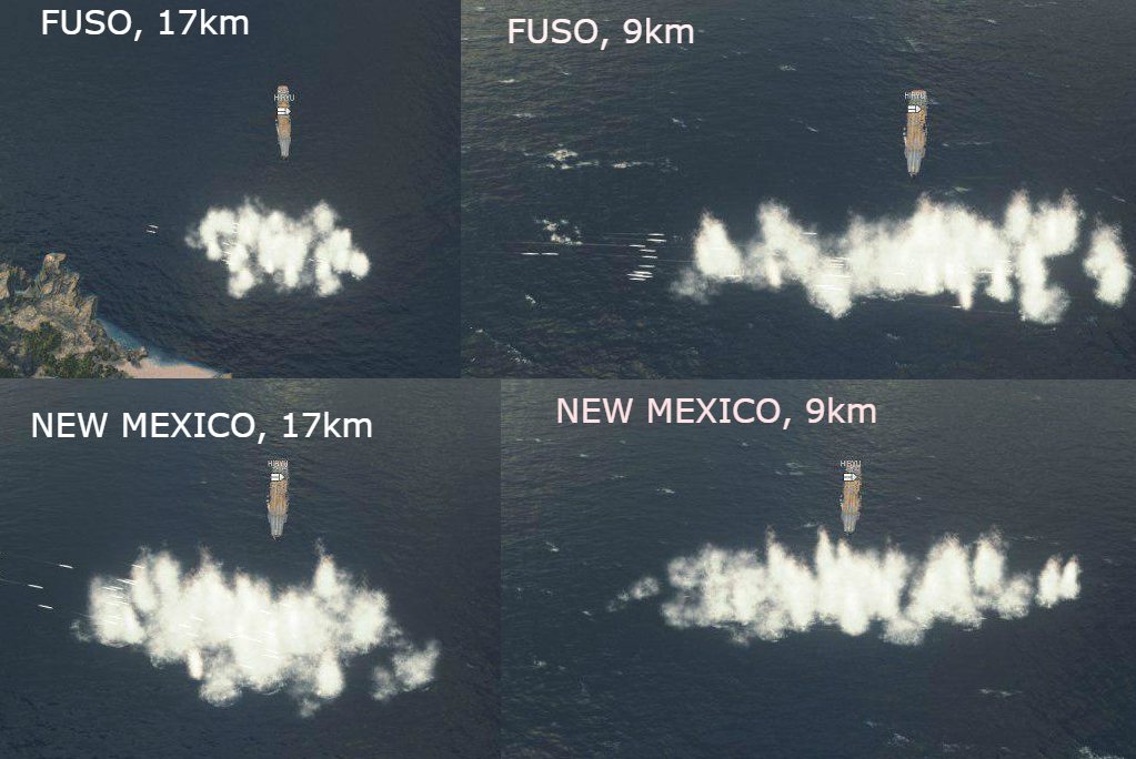 Interessanterweise scheint die New Mexico, anders also die Fuso, auch auf lange Distanzen einen eher flachen Bogen zu feuern. Das ist ja nicht unbedingt, was man von US-Kanonen erwartet. Da scheinen sich also die großen Kaliber der BBs von den kleineren Kanonen der US-Kreuzer zu unterscheiden, die ja für ihre Orbitalflugbahnen berühmt sind.