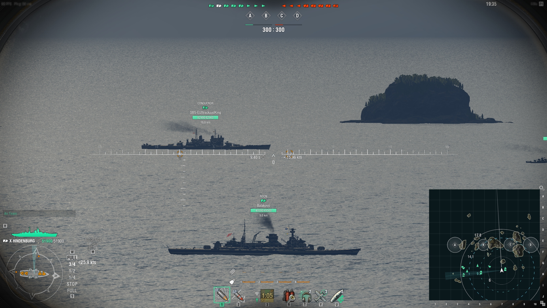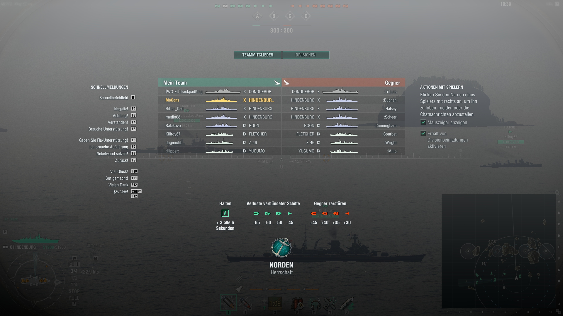 Was mich etwas irritiert hat war: die gegnerische KI Conqueror hatte mir gegen meine Hindenburg eine volle Breitseite gegeben, aber wirklich viel Schaden kam dabei nicht rum, was mich recht erstaunt hat (Overpens bei der Hindenburg werden es wohl eher nicht gewesen sein, nach vielen Abprallern sahs bei mir auch nicht aus). Dafür nahm sie selbst recht fix Schaden durch unsere Conqueror.