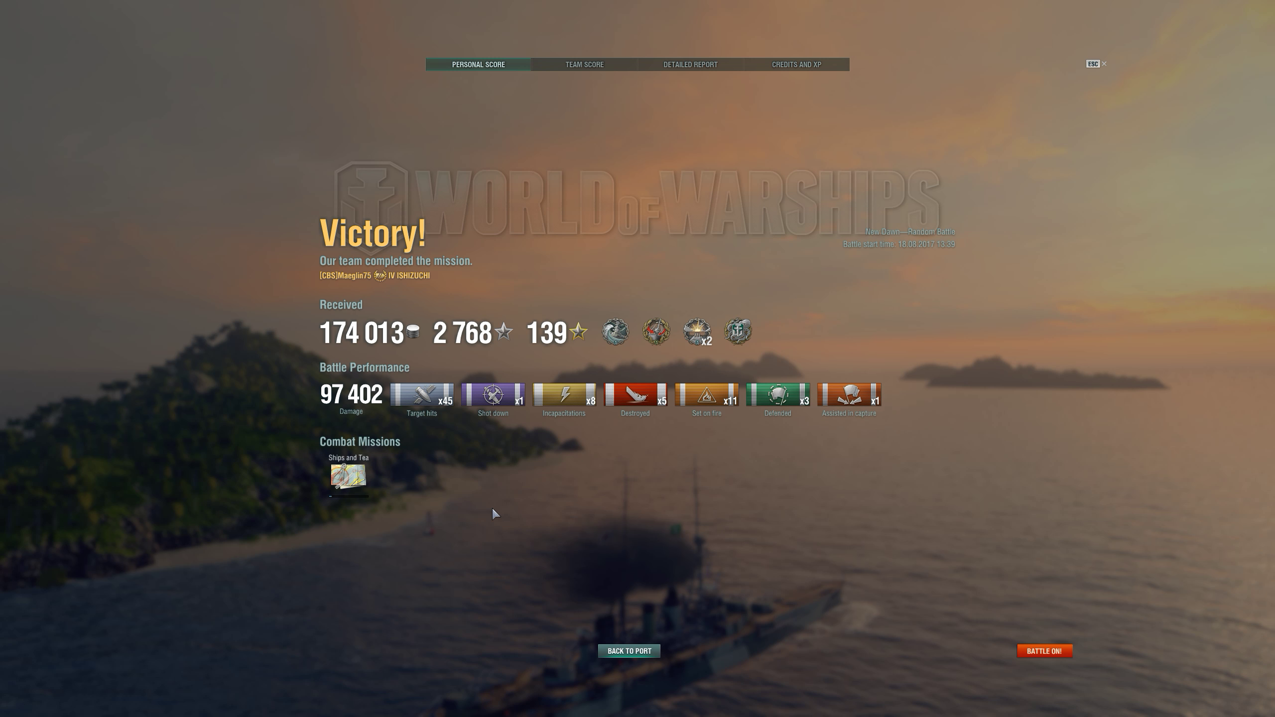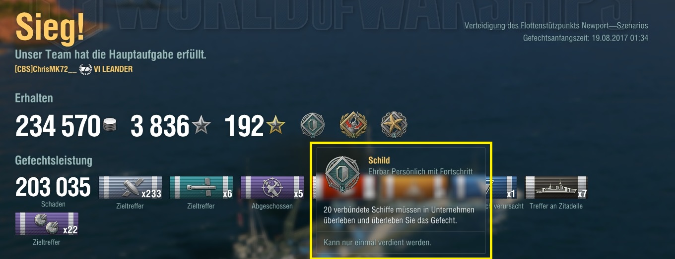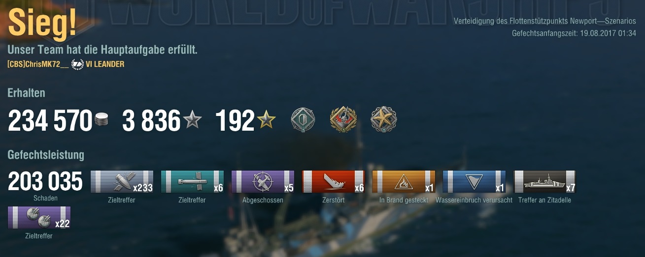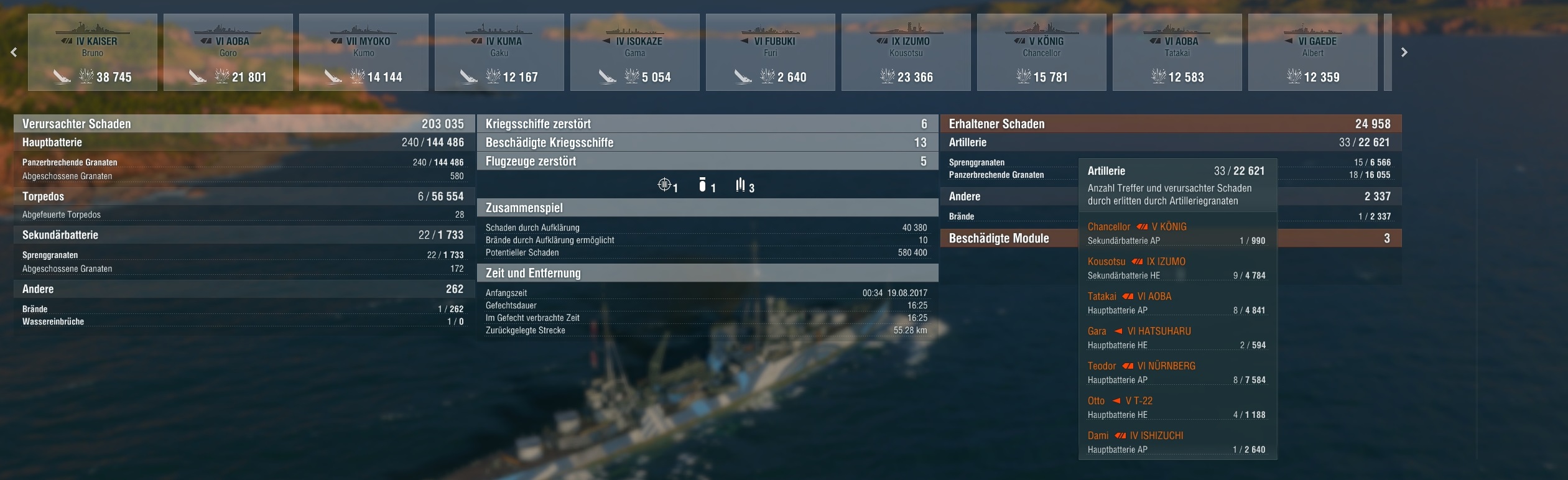 Ne Kutosow mit IFHE war ungemein stark im reinen Damage-dealen, aber auch nicht unbedingt sehr gut geeignet, ein Match zu gewinnen, einfach weil der Brandschaden 100% repariert werden kann - so oft kommen BB mit ein paar HP noch weg, healen und sind am Ende immer noch im Game, obwohl ich gegen den 60k Damage gemacht habe, die aber letztlich dem Team gar nichts geholfen hat. Immerhin war aber ein CA im Game - hoffe, die nerfen die CA nicht raus - mit dem Smoke-Ändern werden letztlich ja auch die britischen CA generft und die DD - ein BB wird dadurch nicht schlechter als es vorher schon war