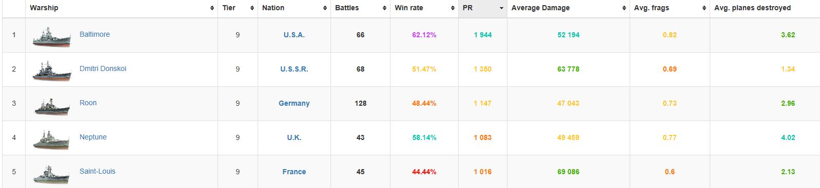 Bei mir (hab alle T9 CA durch) war die Baltimore mit Abstand das beste Schiff - PR, WR, usw. alles Top - nur Damage net ganz soviel, aber das ganze HE-Feuer-Schaden der Donskio, usw. zählt bei Exp usw. nur 50% im Vergleich zu AP-Damage und Baltimore hatte ich sehr viel mit AP gespielt.