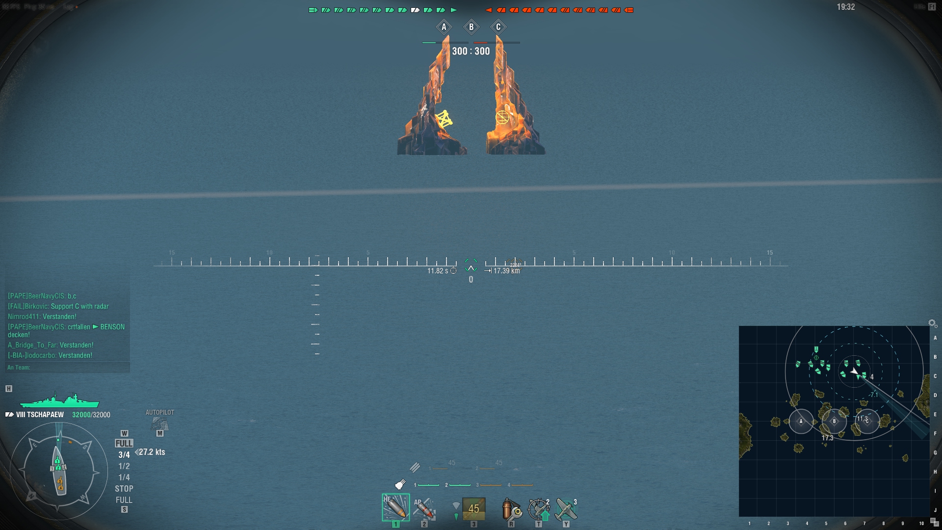 Heute nebenbei auch Hindenburg und Zao gefahren. Manchmal konnte ich den DD beim zielen nicht mehr sehen, weil soviel aufspritzendes Wasser und Rauch von Feuer und Kanonen die Sicht versperrt hat. Ich kann aber auch nicht ewig zielen, weil ich von BB's anvisiert werde und den Kurs ändern muß.