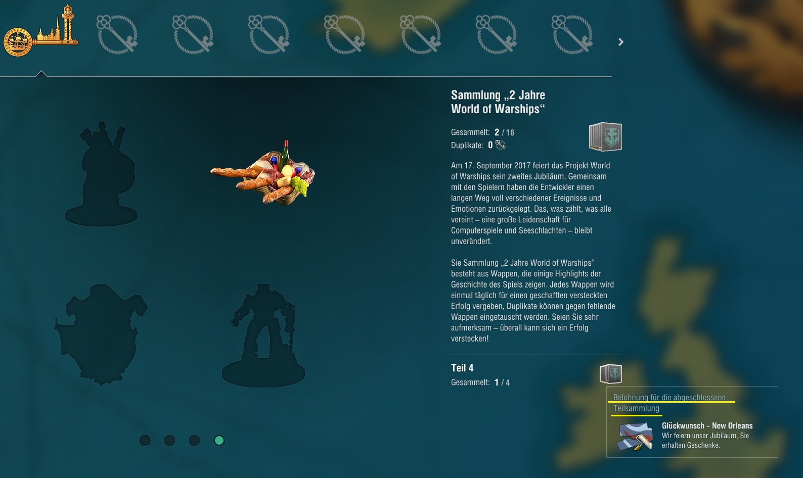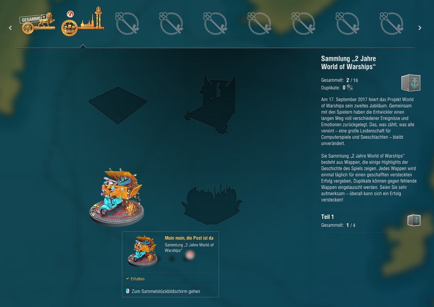 Es gibt vier Teilsammlungen. Je Teilsammlung kannst Du vier Sammlerstücke erhalten. Jede Teilsammlung gibt eine Special Tarnung (Z-23, Kiev, Charles, NO) und wenn du alle vier Sammlungen hast, dann bekommst Du die Monarch.