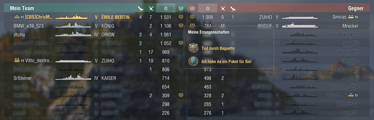 Das einige der Erfolge spezifische Schiffe voraussetzen ist zwar weniger schön, aber sonst wäre es wohl zu "einfach". Dummerweise kann ich mir so weder die Charles noch die NO Tarnung erspielen, aber geht nun mal nicht alles.