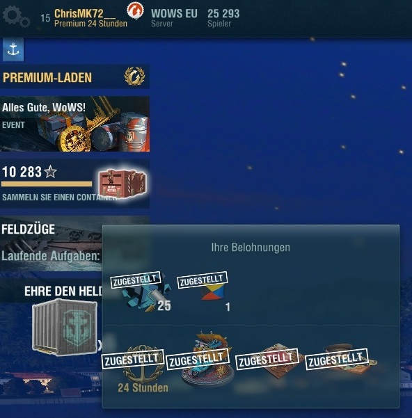 Danke für den Tip mit dem Trainingsraum. Habe aber nur sechs T10 und somit 6 SC eingesammelt. War aber nichts besonderes drin. Insgesamt 21 Tage Premium, Flaggen und ein Modul.