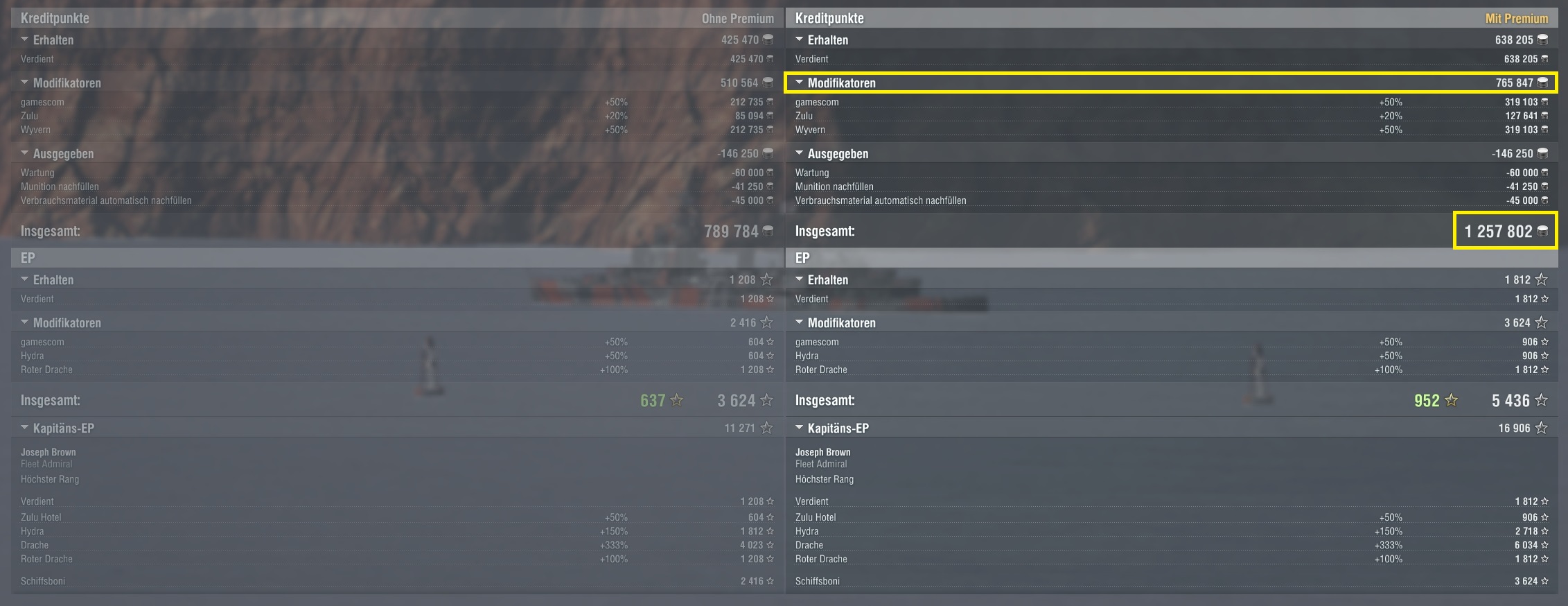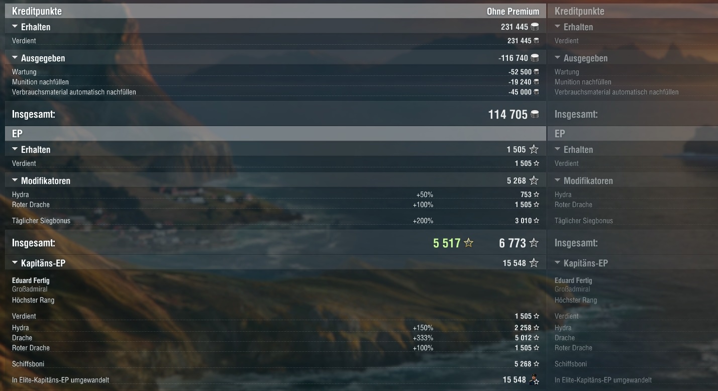 Gestern dadurch mit der Missouri über eine Mio Kredits (1,257 Mio NETTO) in einem Spiel gemacht. Da hatte ich noch die 24 Std. Premiumgeschenk.