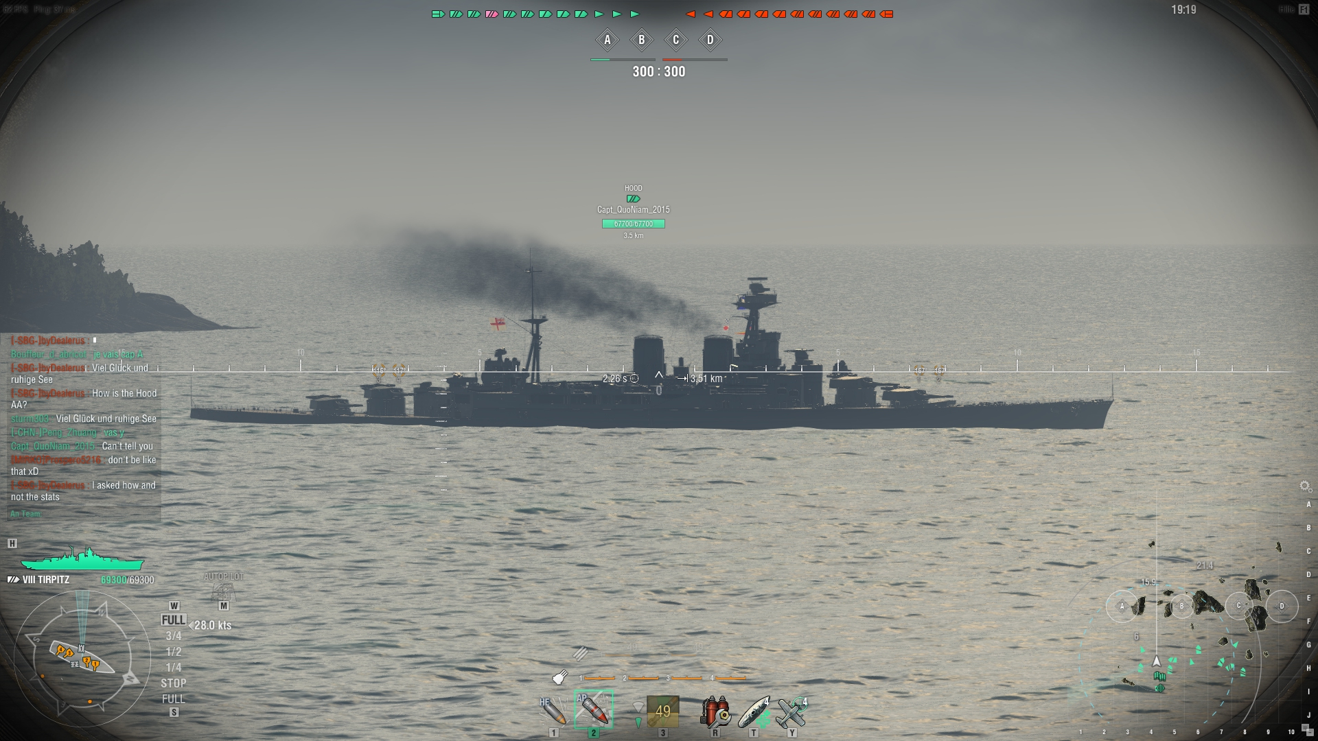 Tirpitz ist eine ganz schöne Umgewöhnung. Erstmal lange nicht gefahren, dazu nun die Sekundäre der Bismarck so dass ich sogar glatt die Torps vergesse