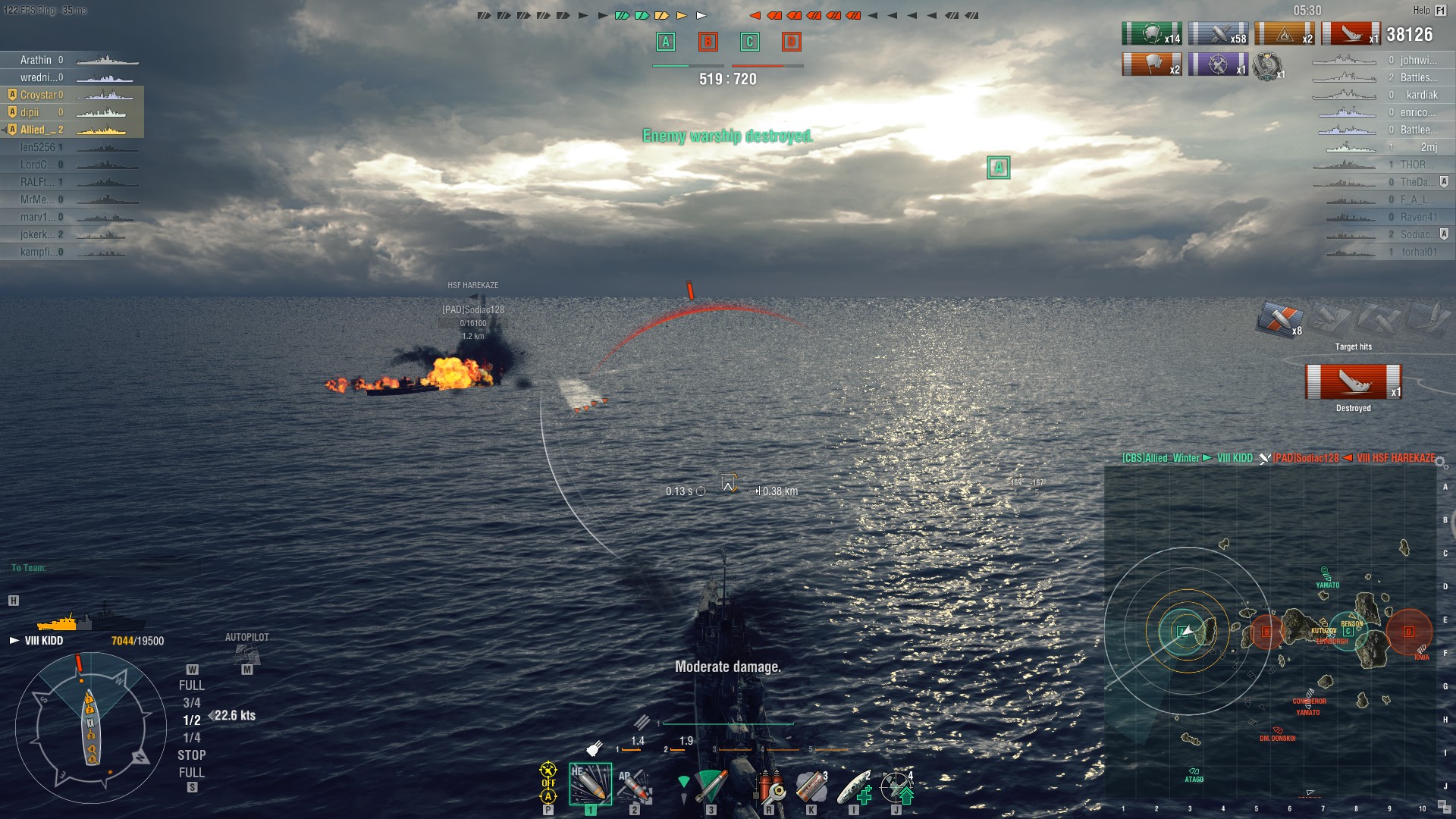 Soooo mal die ersten fünf Kidd Gefechte Revue passieren lassen. Im Großen und Ganzen kann ich LittleWhiteMouse mit ihrer Review zustimmen. Die Kidd ist ein USN DD durch und durch. Allerdings weniger Hybrid und mehr Farragut/Sims Gunboat Style. Womit ich mit ihr nicht übereinstimme ist der Skill Floor. LWM setzt diesen auf Difficult. Sehe ich anders bzw. nicht mehr oder weniger als bei anderen Capcontester DDs. Ja sie hat es schwieriger als ein Z-23 oder LoYang ein Cap zu nehmen. Das gilt aber genauso für die Benson. Man muss sich daran gewöhnen wie ein RU DD auf offener See auf große Ziele zu feuern. Problem: Die Gunarcs. Man kann zwar bis 12km feuern, aber da trifft man dann auch nur noch stehende oder stur geradeausfahrende Ziele.