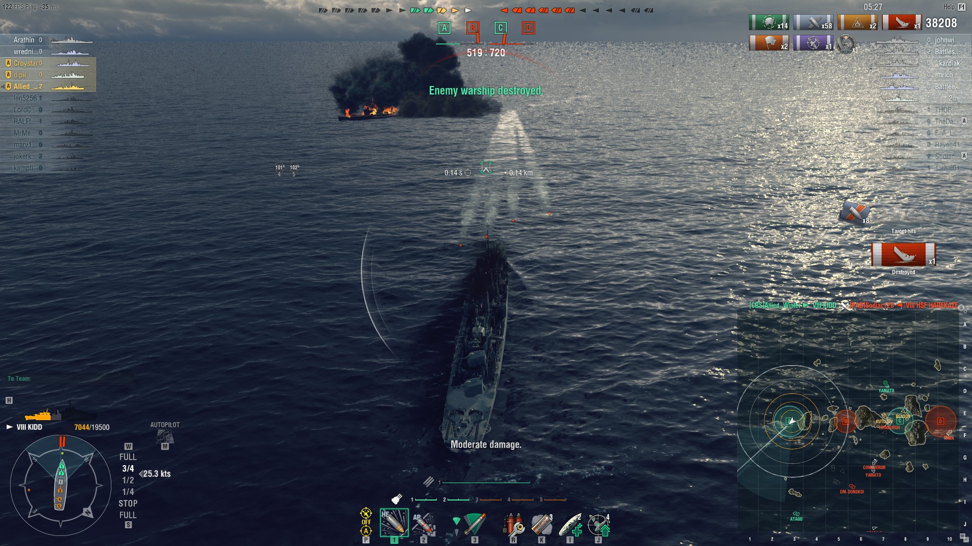 Natürlich muss man wie immer aufpassen, auch gerade gegen gute Hydro DD Spieler und wie immer alle möglichen Radarschiffe und spotting durch Flieger usw. , nur würde ich in dieser Situation lieber in der Kidd, als in der T61 sitzen.