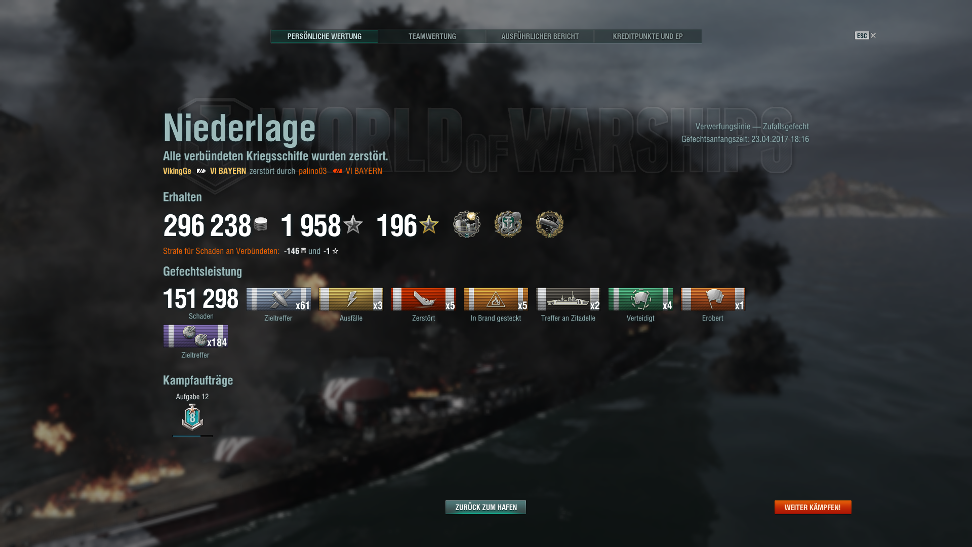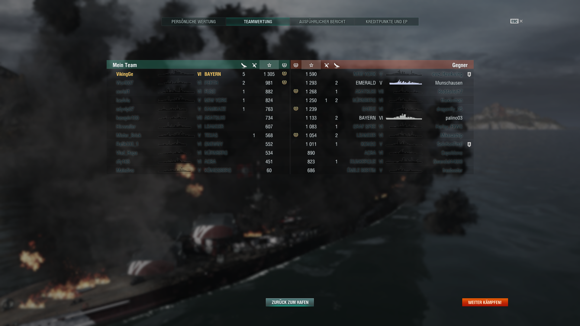 Gerade eine sehr... interessante Runde in der Bayern gehabt. Lange als letzter Überlebender des Teams herumgekurvt, aber mit zeitweise unter 2k HP. Ganz am Ende die (zugegebenerweise geringe) Chance verpasst, die Bayern, die mich versenkt hat, aus nächster Nähe mit ner guten Salve zu versenken und das Spiel doch noch zu gewinnen. Aber hey, Kraken, High Caliber - da ich nun kein wirklich guter Spieler bin, passiert das nicht alle Tage.