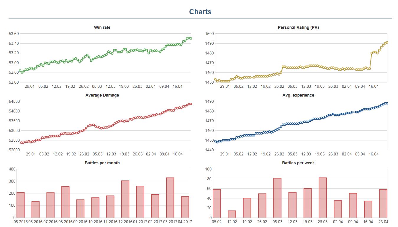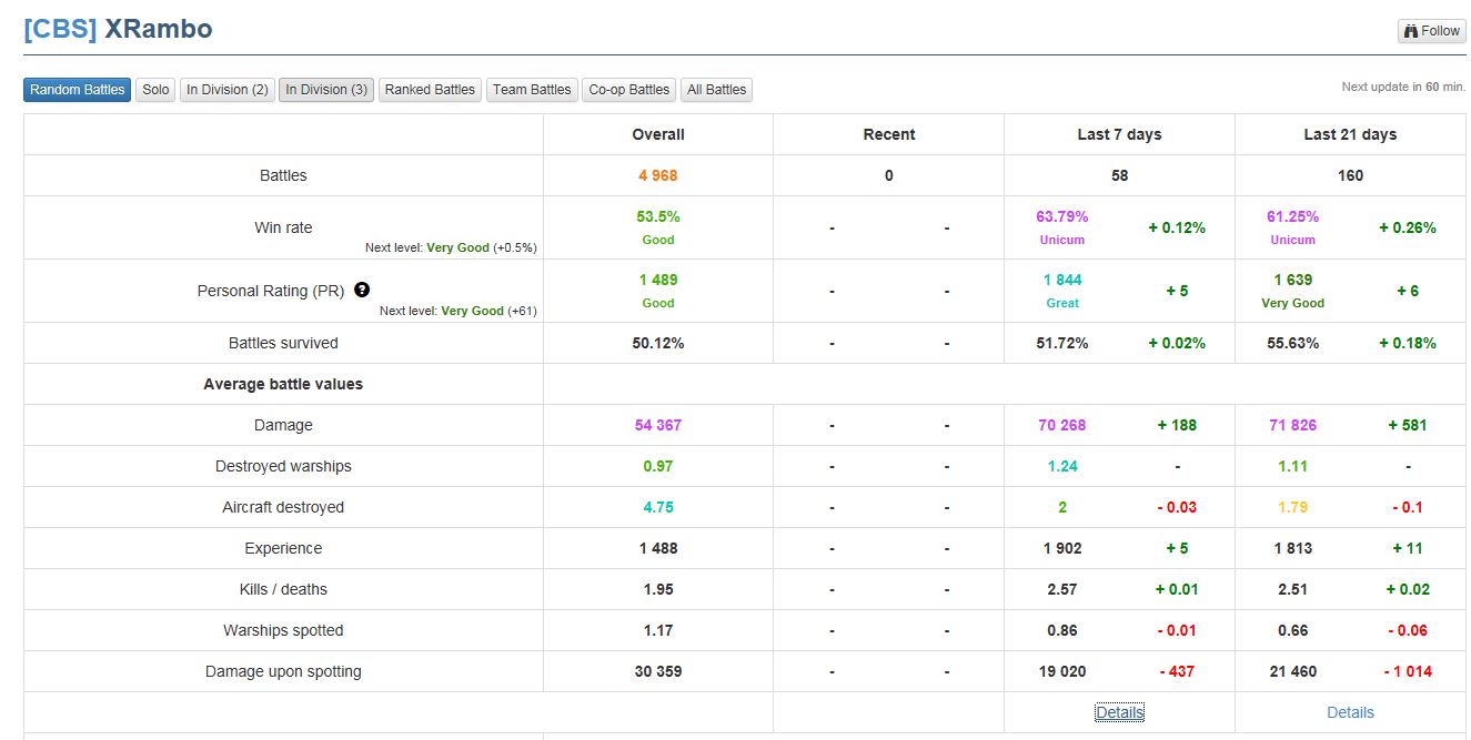 Weil ich grade daran denke und kurz Zeit habe: Insgesamt eine beständige Entwicklung, sicherlich auch darin begründet, dass man mehr High-Tier-Schiffe hat, als zu Beginn, man auch mehr spezielle Tarnungen hat, als noch zu Beginn des Spiels, aber immerhin, es geht kontinuierlich aufwärts. Nach nun 4.968 Zufallsgefechten (alles Zusammen habe ich 5.575 Gefechte)