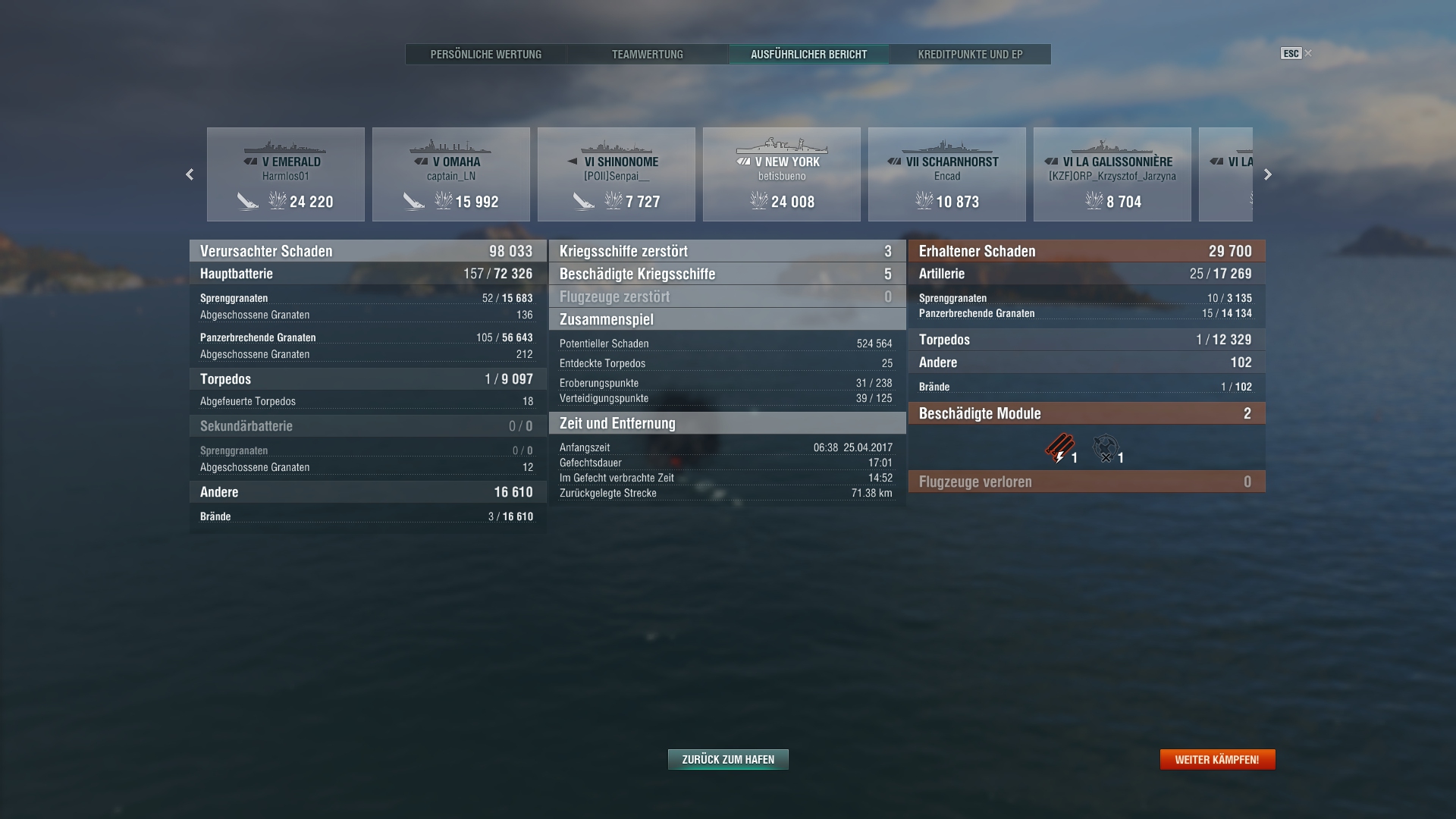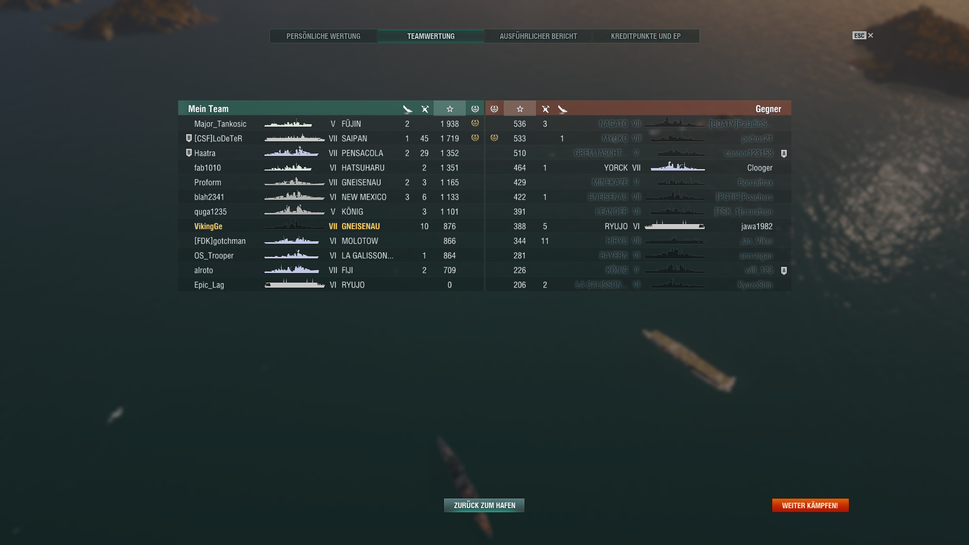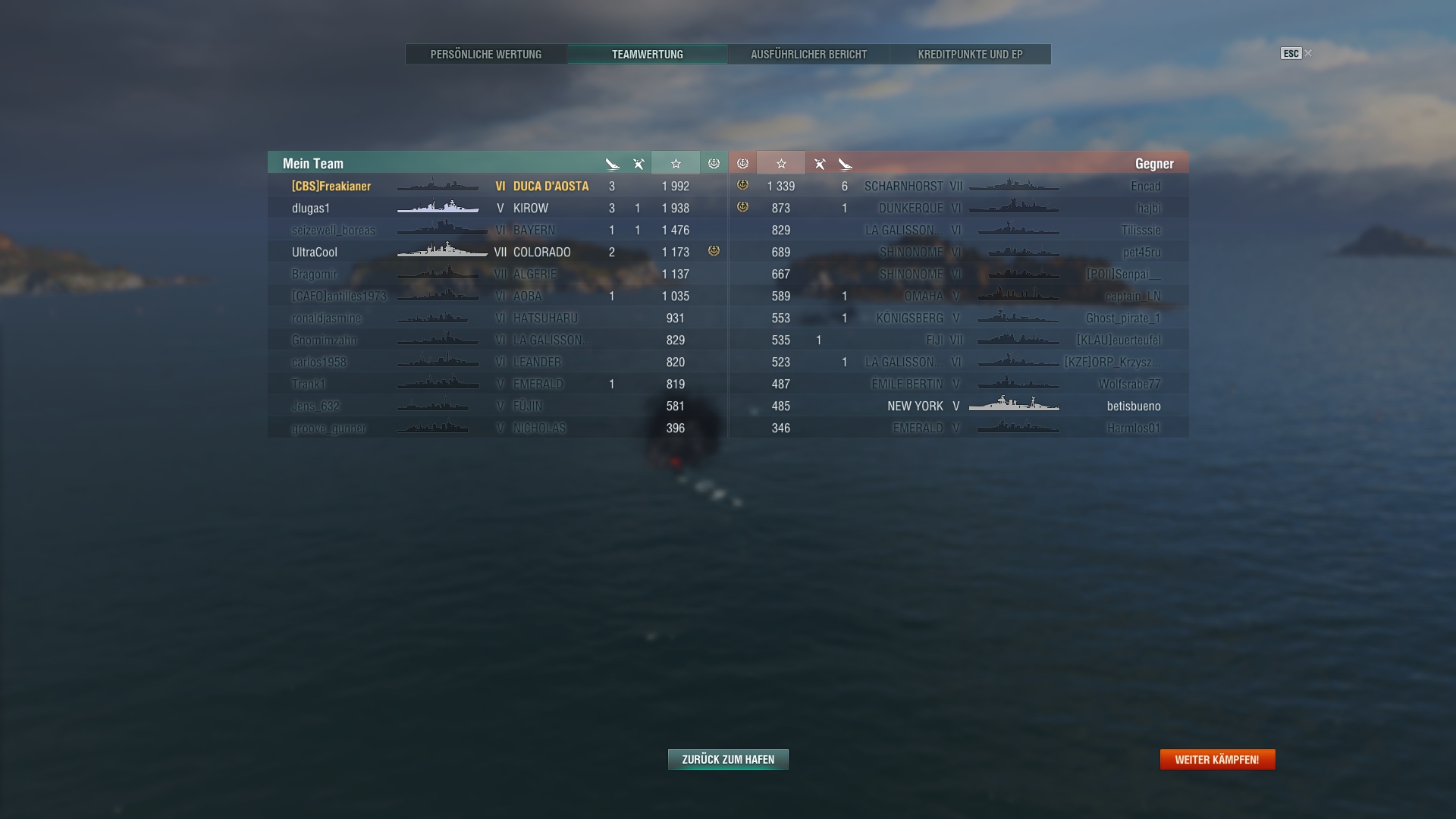 Ein feindlicher Kreuzer in 10 km (angeschlichene Atago) und der Rest so 13-18 km entfernt. Du an vorderster Front und im Fokus von allen Feinden. Du verlierst die Hälfte deiner HP und ihr könnt durch Fokusfeuer die Atago rausnehmen.