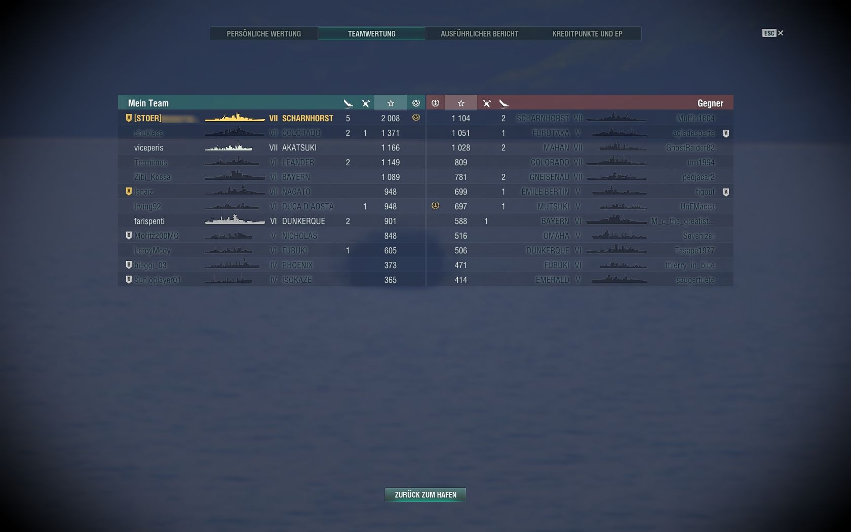Jeweils schräg links und rechts vor mir standen eine Tirpitz und ein Freidrich d. Große. Mein Plan war es, diese stark zu beschädigen und dann zu torpedieren. Leider war Neptun nicht auf meiner Seite und meine beiden Fronttürme wurden zerstört *lol* - insgesamt "3" Stück, denn beim ersten mal habe ich dann schon repariert...., danach wurden quasi zeitgleich beide ausgeschalten und ich hatte dann doch die Beständigkeit meiner Panzerung unterschätzt und frontal zu viel Schaden genommen, sodass ich letztlich untergegangen bin, ohne die Torps zu setzen (es hätten wirklich nur noch 5 Sekunden gefehlt, määäh