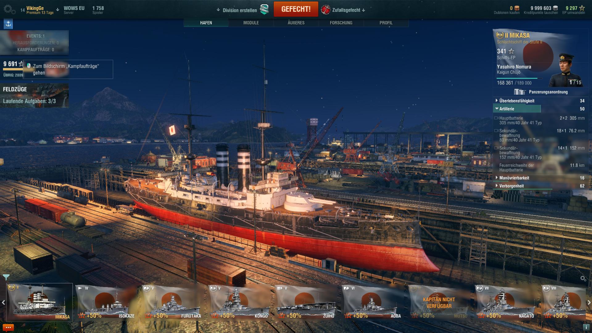 Mit der nächsten Ladung XP wird dann die Yamato freigeschaltet. Dürfte heute so weit sein, ein paar Runden in der doch ziemlich nervig zu spielenden Izumo sind aber noch nötig. Die ist übrigens auch so ein Fall, wo man zwingend den C-Rumpf braucht, um überhaupt nach links und rechts fahren zu können.