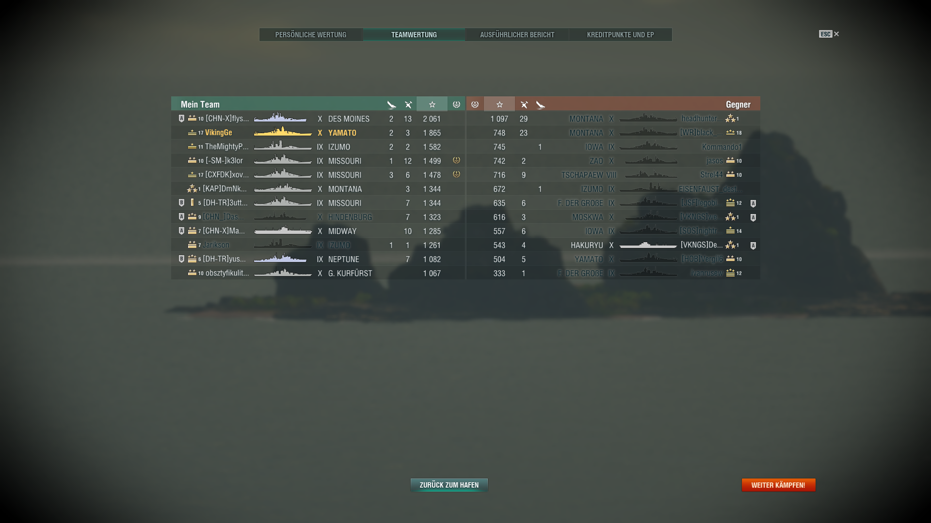 Mit der jetzt niedrigeren Zitadelle und der Umverteilung der HP (zischen den Sektionen des Schiffes) müsste ich der Iowa wohl nochmal eine neue Chance geben. Bisher hatte sie mir jedenfalls nicht so gut gefallen, wie die NC.