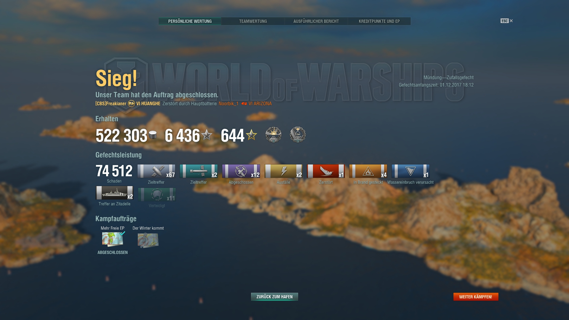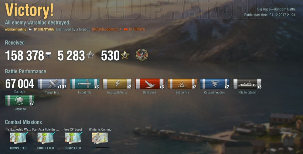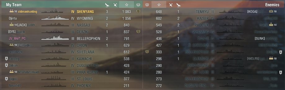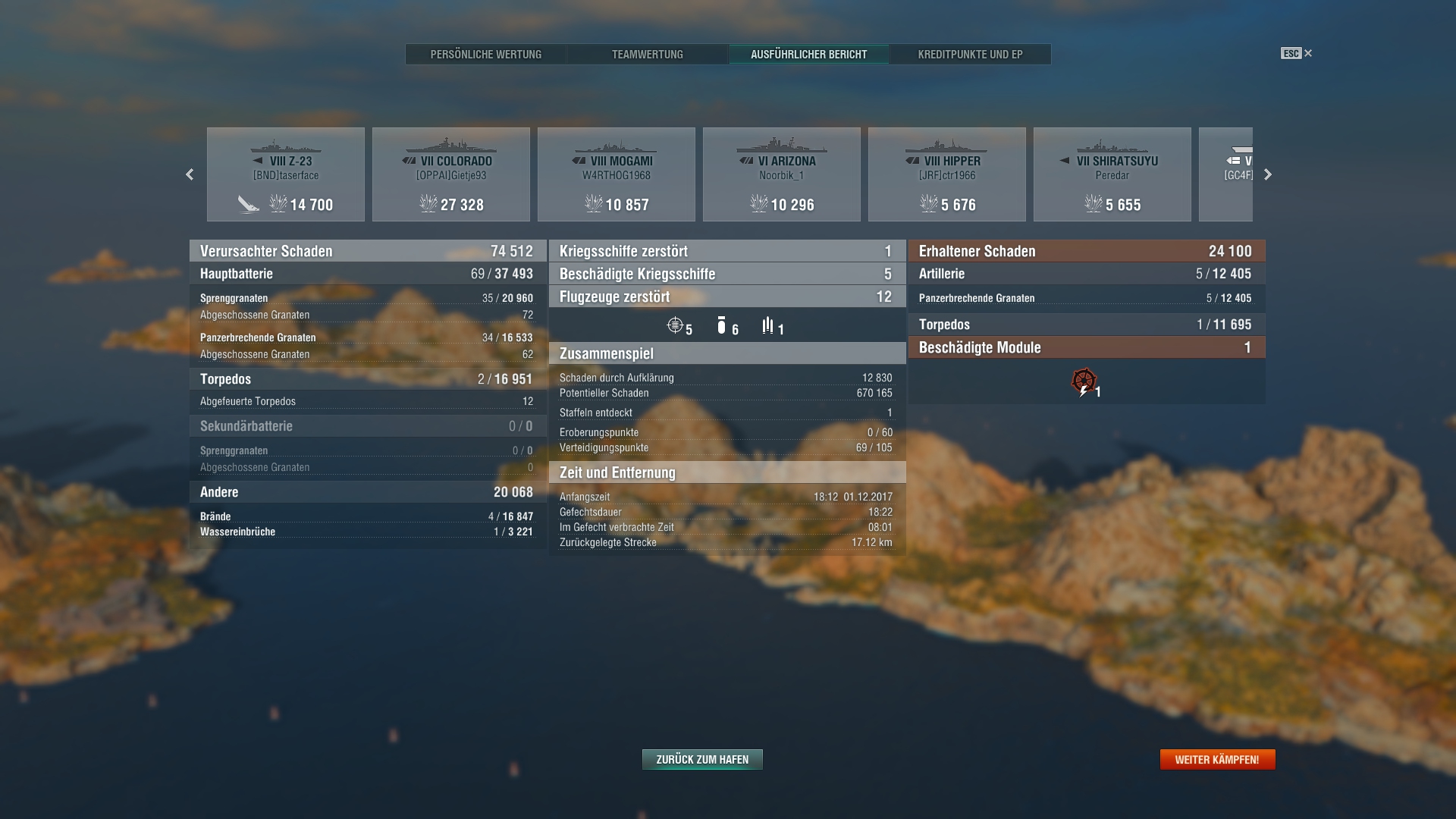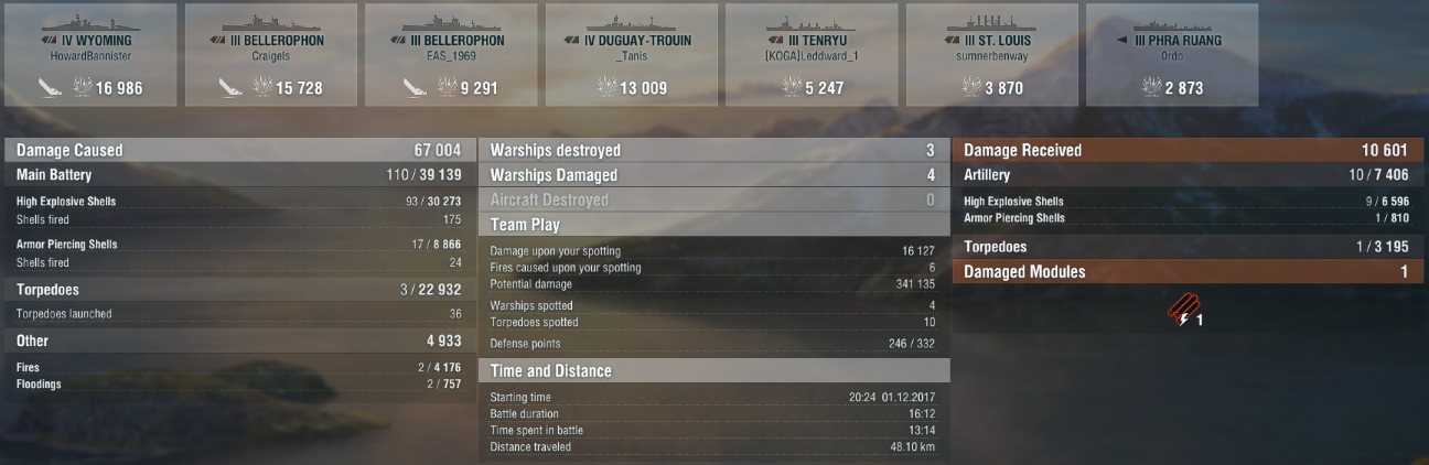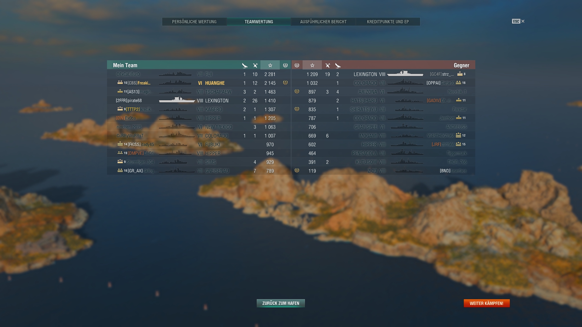 Ich hatte überlegt ob ich mir den neuen Pan Asia Kreuzer, die Huan HE kaufe ... . Nun habe ich es getan, weil mich auch die Perth reizte, weil sie ebend einzigartig ist. Und die Huan HE scheint wohl zudem auch eine bessere Perth zu sein. Nun ja ... das erste Spiel mit ihr, gleich in Tier 8. Aber sie hat sich erstaunlich gut geschlagen darin! So z.b. 12 Flugzeuge einer Lexington runter geholt vom Himmel, Zitadelle auf Mogami - und das obwohl noch leicht angewinkelt. Dazu schöne Torps und gute Kanonen. Ingesamt ein wirklich schönes Schiff auf Tier 6