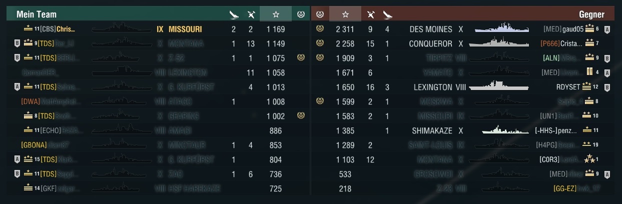 Es ist schon erstaunlich, dass wirklich jede neue Linie irgendwie stärker wird, als alles was es bis dahin gab. Conquerer hab ich jetzt und das Schiff ist schon echt stark. Sofern man nicht gefocused wird, ist man kaum zu zerstören - 11,xkm weg vom Feind und man ist unsichtbar, kann hoch heilen und dann wieder schauen, welchen Feind man überrascht. Die AP finde ich gar nicht schlecht - die 419er hauen jedem CA ordentlich was rein und auch den BB´s kann man damit gerne mal 20k drücken pro Salve. HE brauchen wir gar nicht reden - Salven, die 3x Feuer machen und dazu 10k Schaden, egal wie der Gegner steht - WOW. Denke, dass die Conquerer die Montana im CW fast den Rang ablaufen könnte, besser als Kurfürst und Yami ist das Schiff auf jeden Fall - zumindest in CW, wo es nur 1 BB gibt.