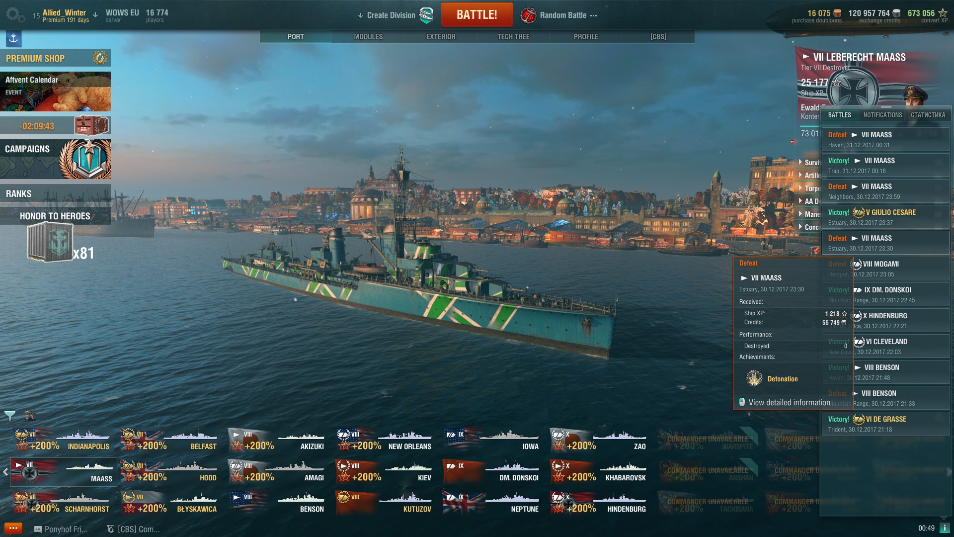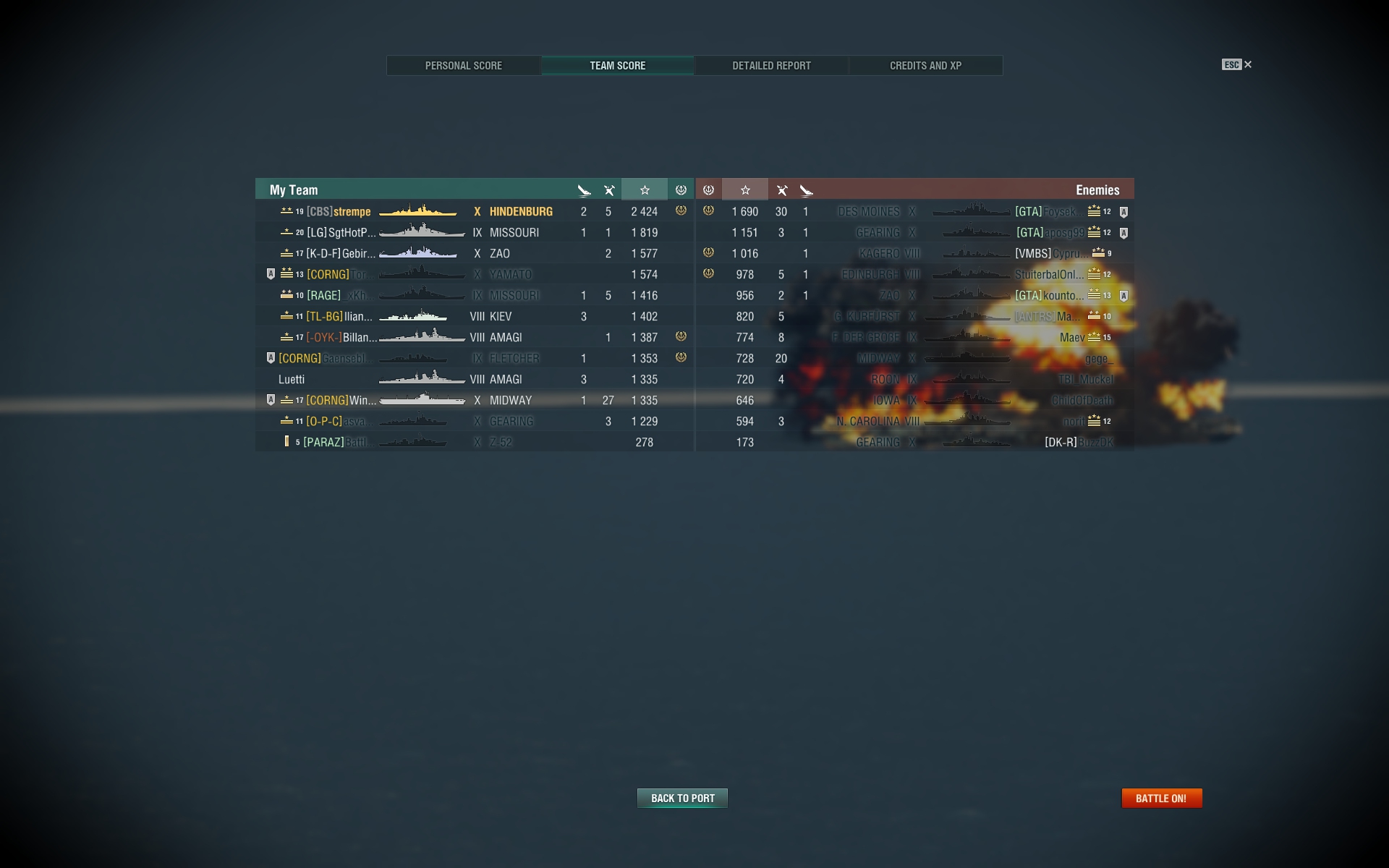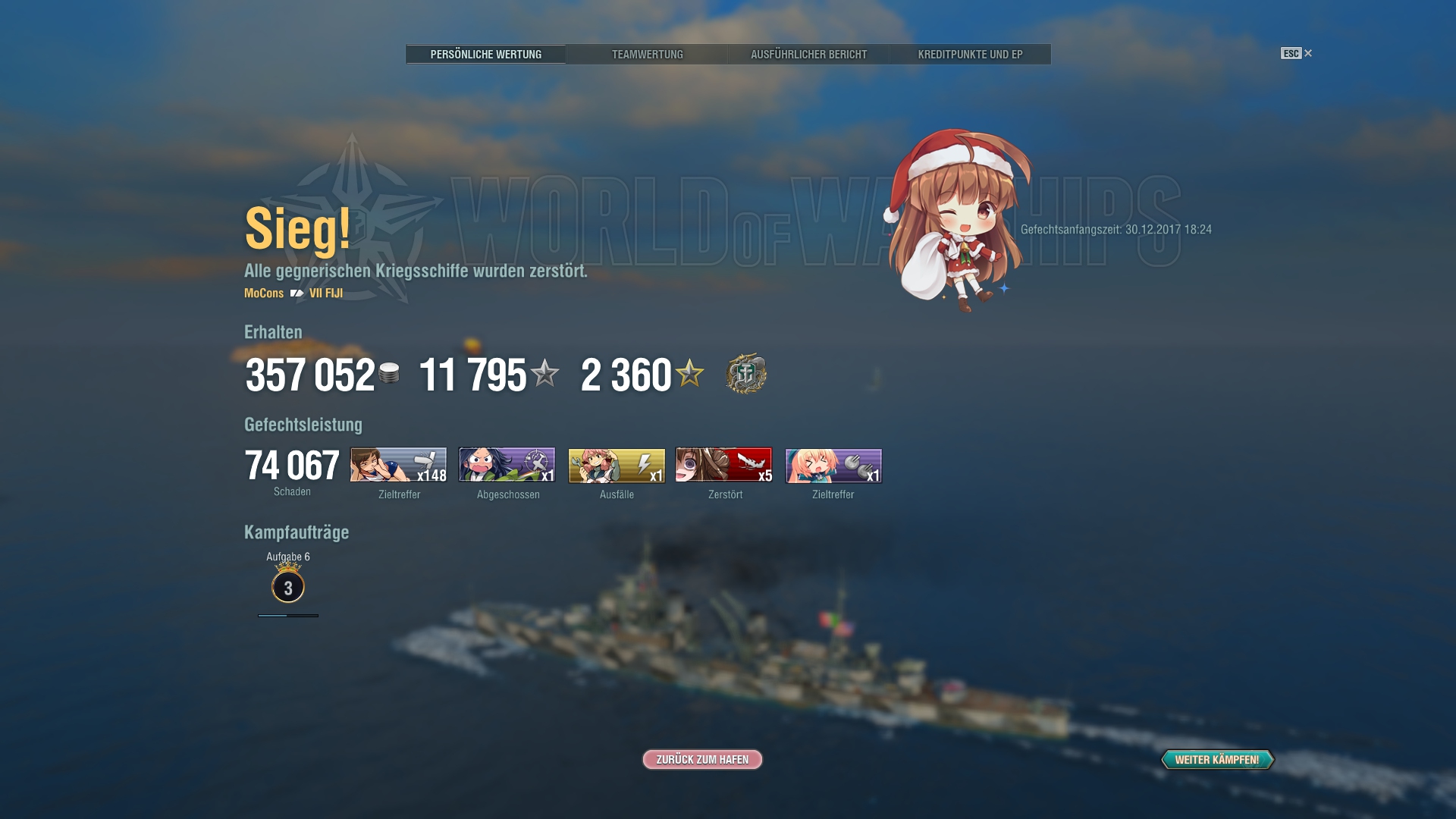 Fiji@Stock steht im Hafen. Nachdem die ersten zwei Matches echt mies liefen (im ersten Match hat mich eine BB Salve aus ~18km Entfernung getroffen direkt auf den Bug, 3 Granaten, zwei Zitadellen bei mir gemacht und wubb, mit zero DMG aus dem Match), hat es sich in den folgenden Matches gebessert und im 4. war gleich die Krake drinne mit einer Menge Support und Co.