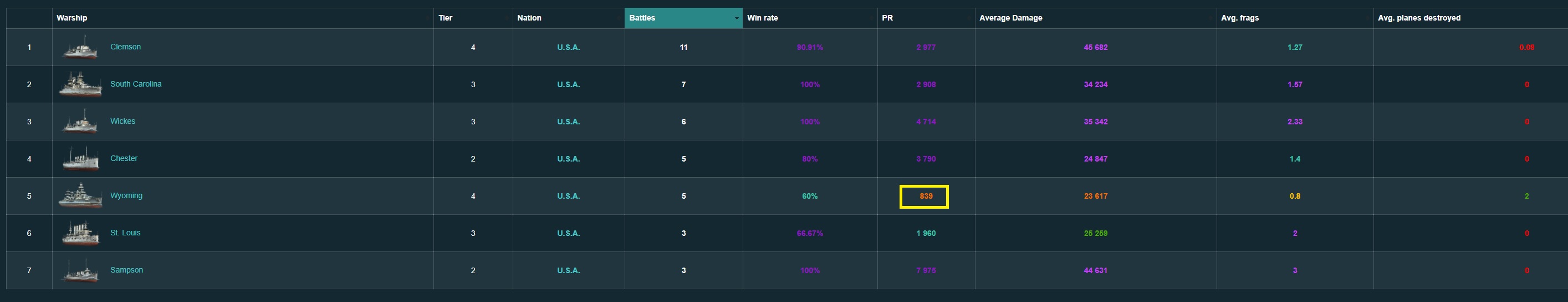weiß jemand zufällig, wie die PR-Rating auf WoWS Stats and Numbers zustande kommt? Kann das nämlich für mich so gar nicht nachvollziehen. Meine letzte Runde in der Ibuki war ganz normale Runde. T7-T9, 1 Kill, 83k Damage, nur HE/Feuer, ca. 5k davon auf DD, Rest auf BBs. 10k spotting Damge - das wars - da bekomm ich ein PR von 2.758? Wtf - bei gefühlt wirklich guten Runden komm ich auf 1500-1800 und bei so einer absolut 0815-Runde schreiben die mir 2.758?